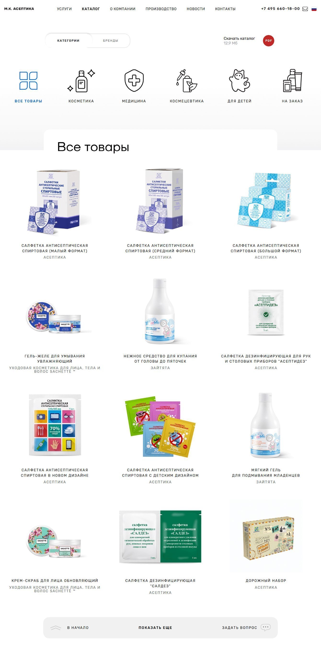 На сайте представлен широкий ассортимент продукции компании, включающий средства для дезинфекции, косметические и гигиенические товары.