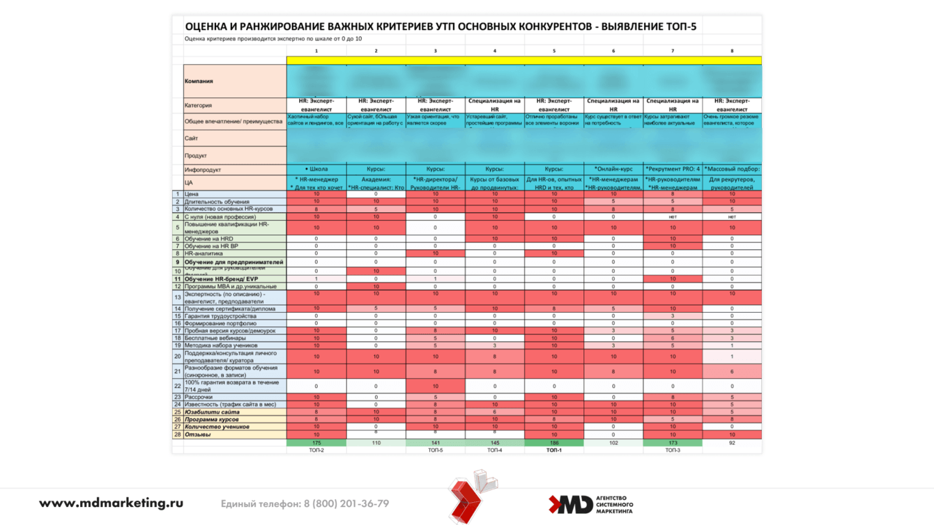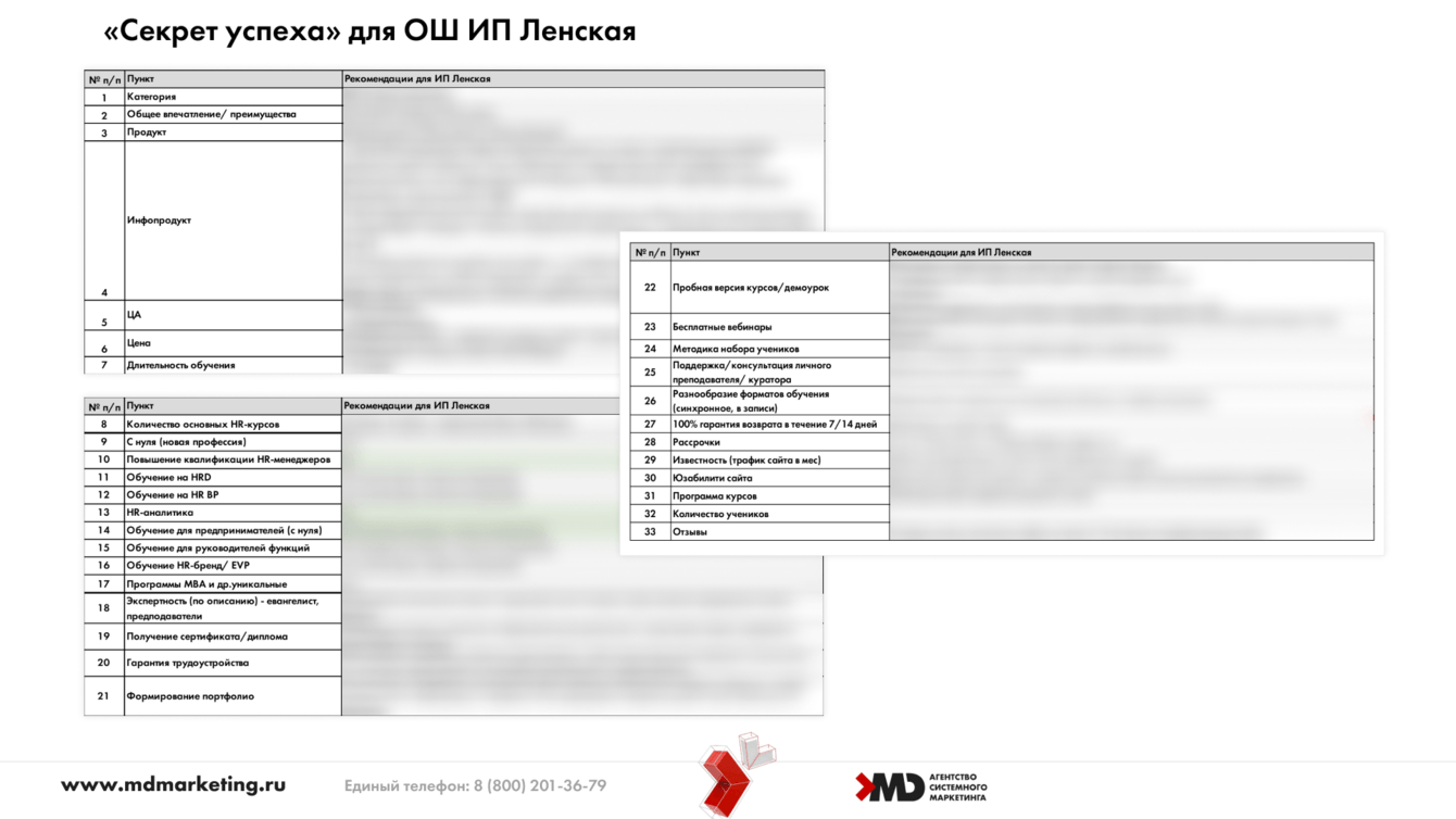 На этом шаге мы подробно описали каждого конкурента: его продукты, УТП, воронку, аудиторию, длительность обучения. Из этих данных мы выделили 32 фактора успеха и по каждому сформировали рекомендации для онлайн-школы клиента.