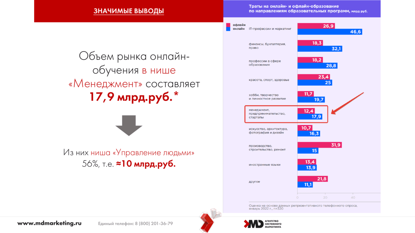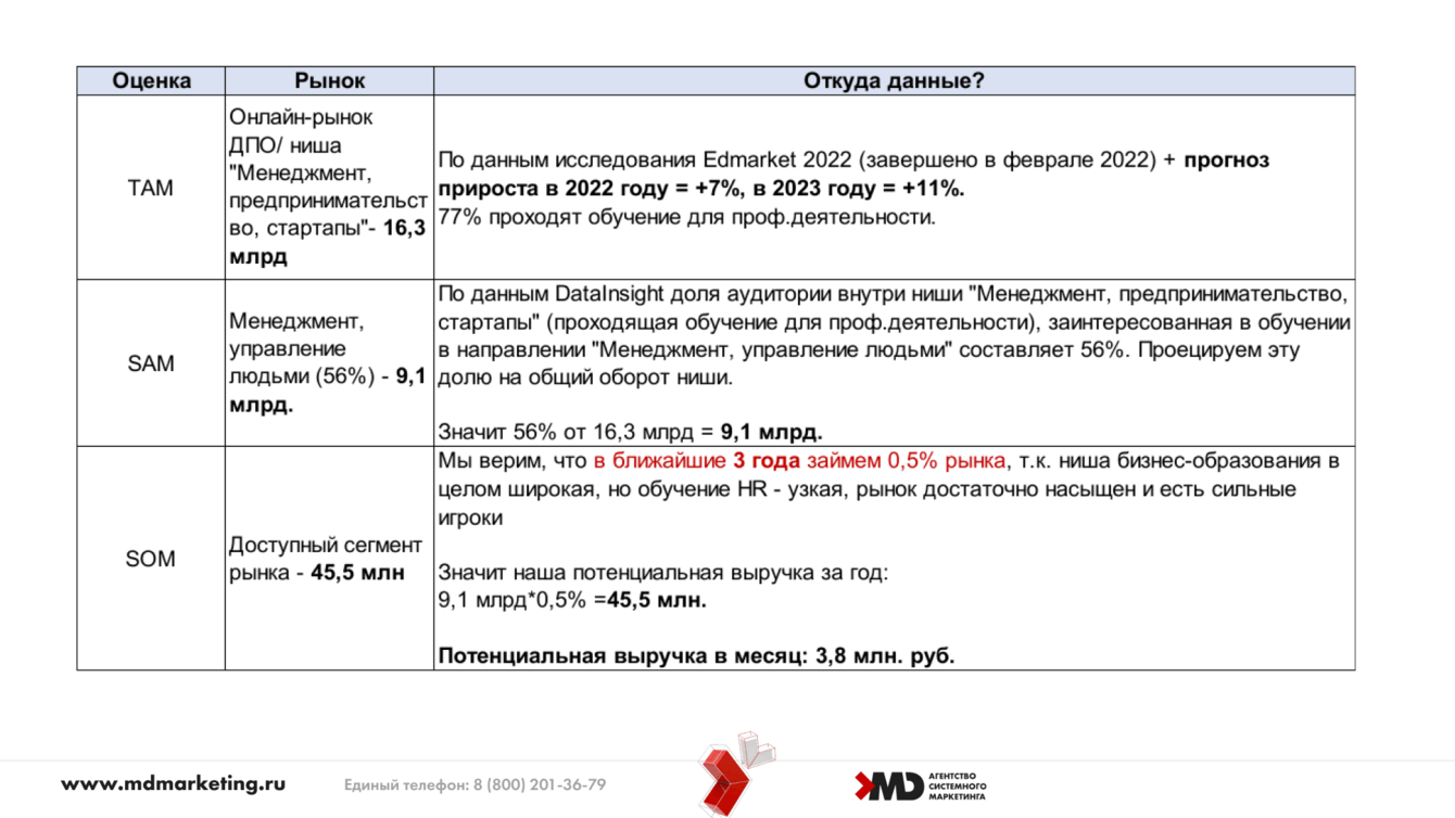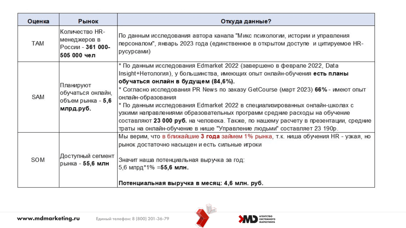 Перед тем как начинать что-либо планировать, нужно убедиться в том, что у проекта есть потенциал, понять, как уже развивается рынок онлайн-образования в HR-нише. Для этого мы провели кабинетное маркетинговое исследование, в котором оценили не просто динамику, но и финансовые возможности для клиента.
