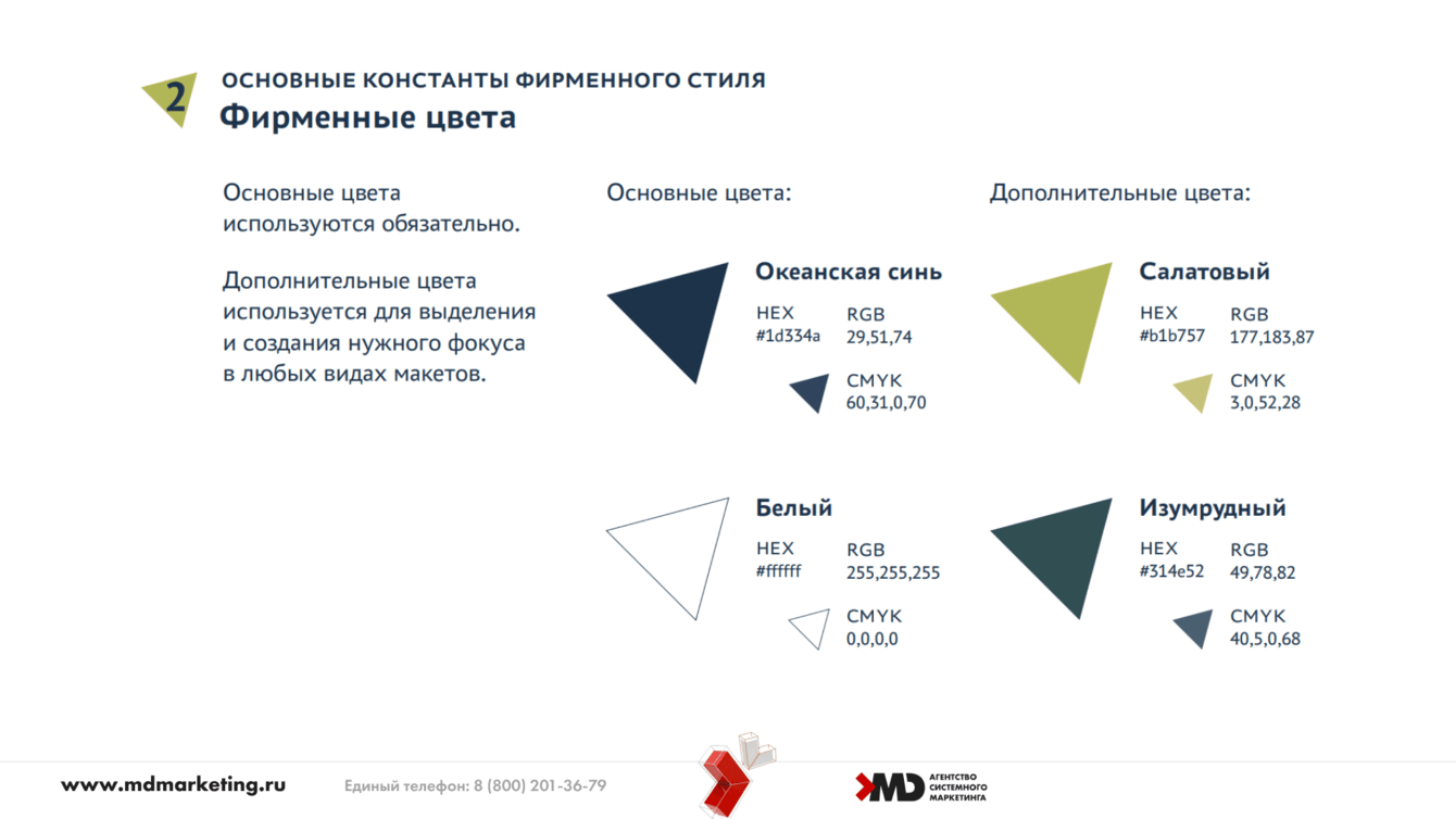 Также мы прописали фирменные цвета: основные и дополнительные для создания фокуса.