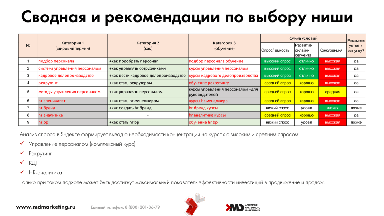 Мы сформулировали рекомендации по выбору ниши, информацию о запросах клиент также сможет использовать при дальнейшей разработке программ обучения и формировании контента.