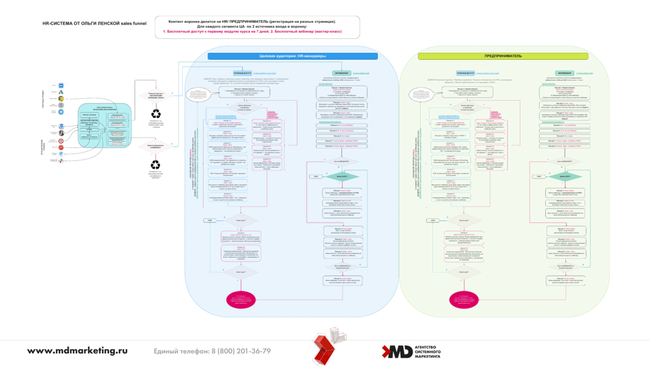 Разрабатывать стратегию продвижения мы начали с воронки продаж для каждого курса. Она представляет из себя большую подробную блок-схему, где прописаны: