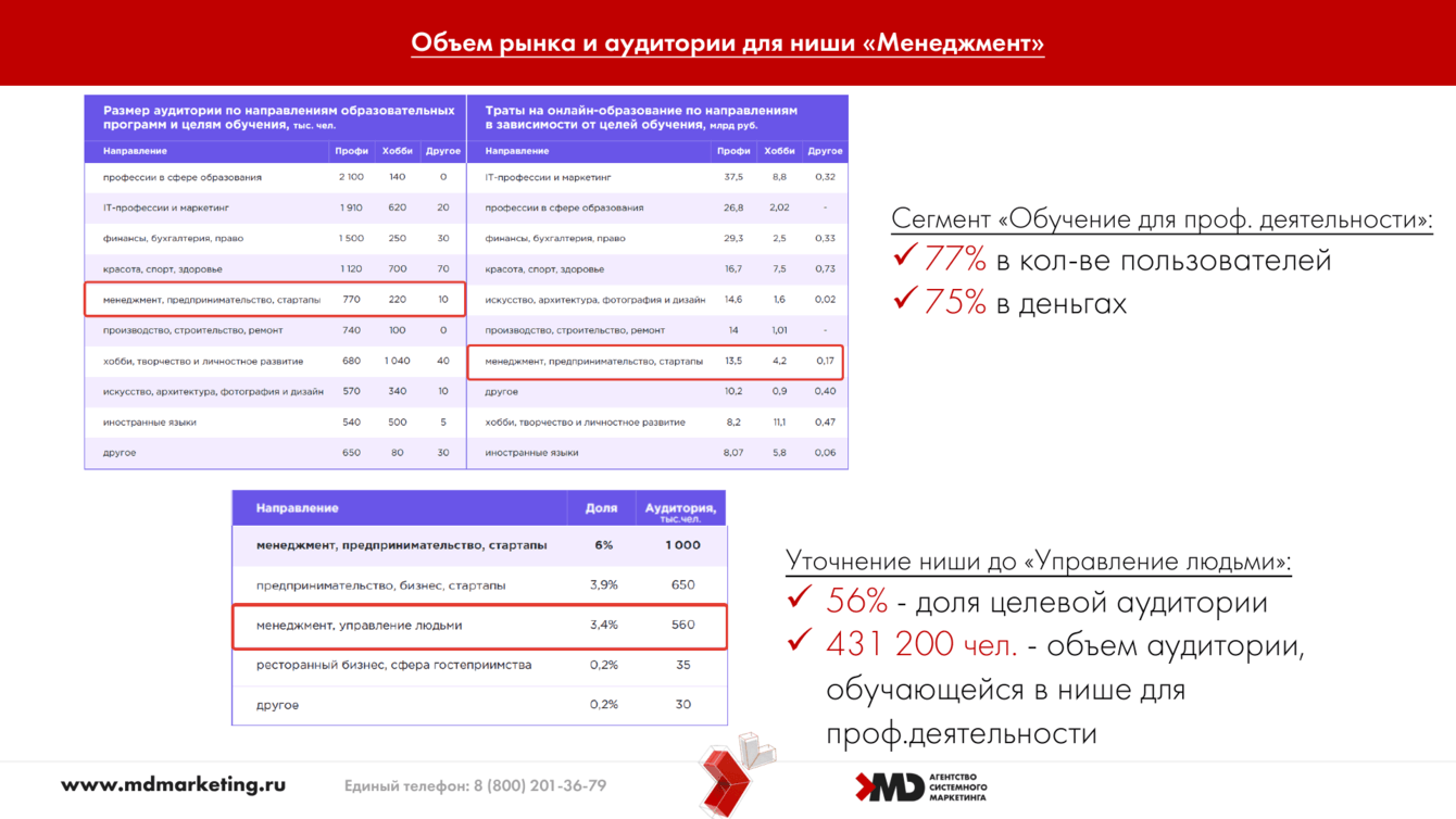 На этом этапе мы выделили объем аудитории, обучающейся в нише «управление людьми» — то есть объем потенциальных покупателей для Ольги Ленской.