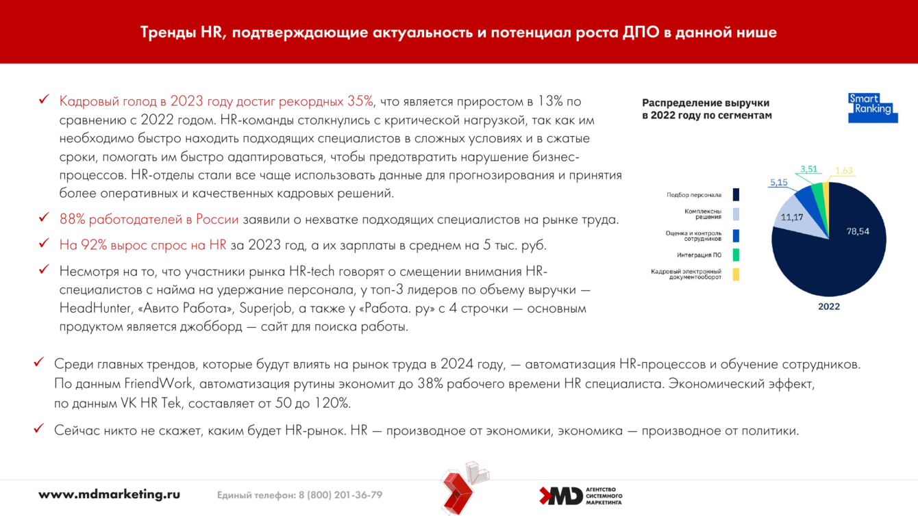 С исследованием онлайн-образования в HR-нише были небольшие сложности. Дело в том, что со стороны регулирующих органов к инфобизнесу появился заметный интерес, и компании, работающие в этой сфере, неохотно раскрывают данные. Мы собирали и консолидировали информацию по крупицам, чтобы сформировать ясную картину. В первую очередь рассмотрели тренды в HR-нише, кадровую ситуацию.