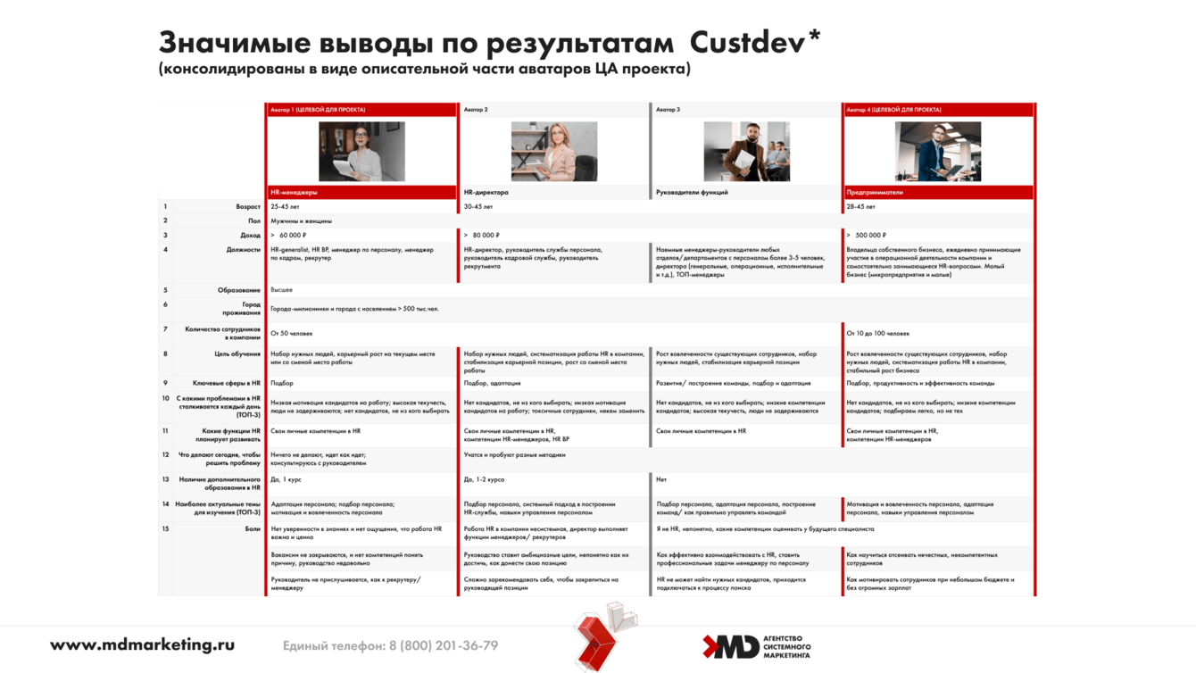 Результатом анализа стало описание аватаров по категориям «HR-менеджеры», «HR-директора», «Руководители подразделений» и «Предприниматели». В каждом аватаре мы прописали: