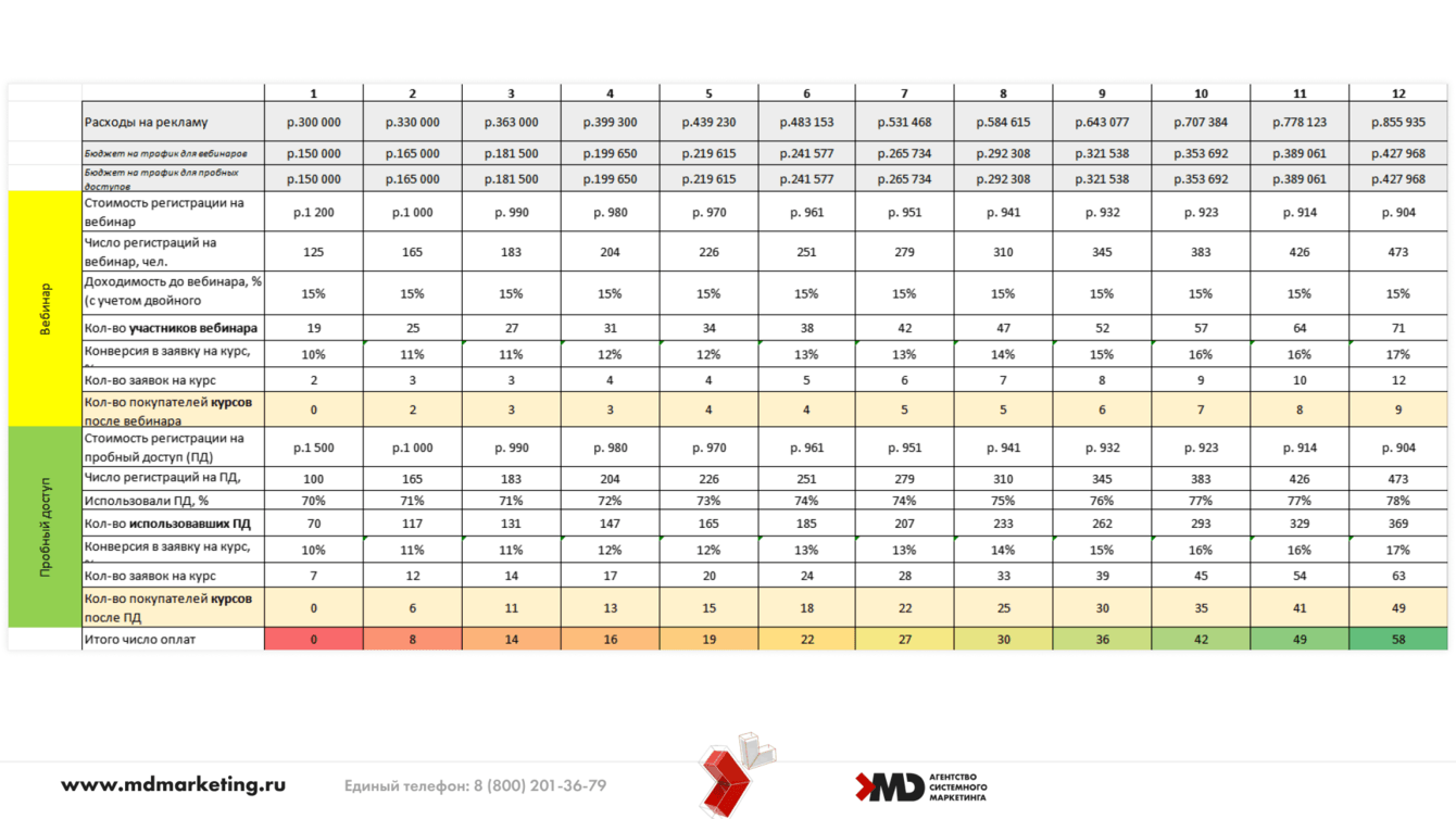 Также отдельно показали, как конвертируются лиды на каждом этапе воронки, и какое число покупателей ожидать при конкретном рекламном бюджете. План строили по пессимистичному сценарию, чтобы не обмануть ожидания клиента.