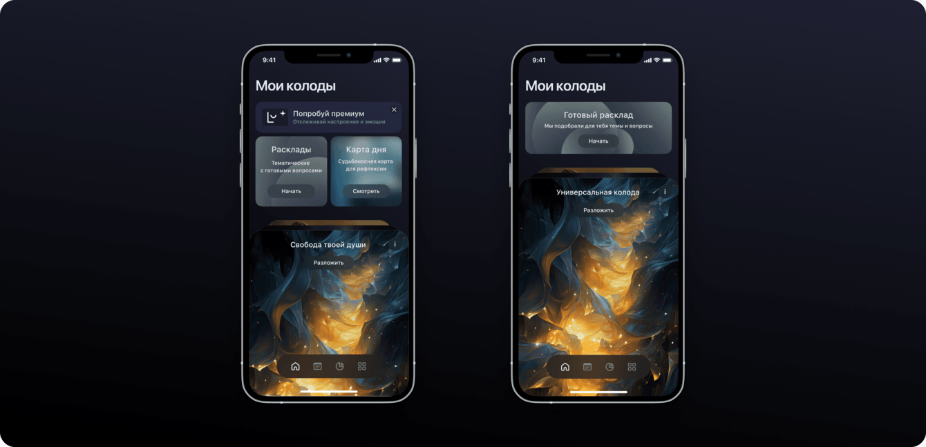 Работа с метафорическими картами предполагает, что пользователь минимум раз в день заходит в приложение. Наша целевая аудитория — это клиенты заказчика. Привычка регулярно делать расклады у них либо уже сформирована, либо формируется за счёт заказчика. Мы спроектировали интерфейс таким образом, чтобы всё в нем работало на закрепление этой привычки.