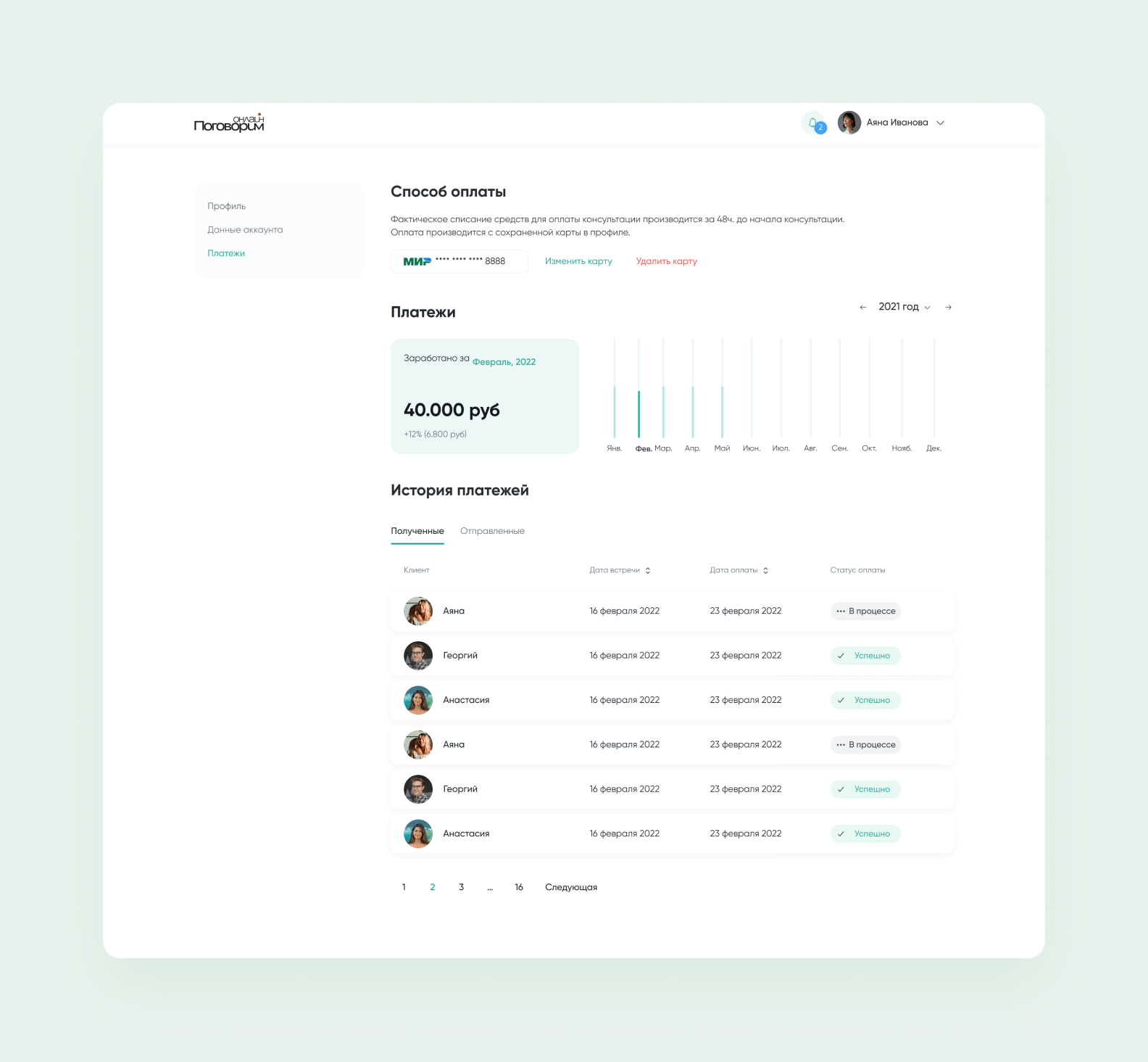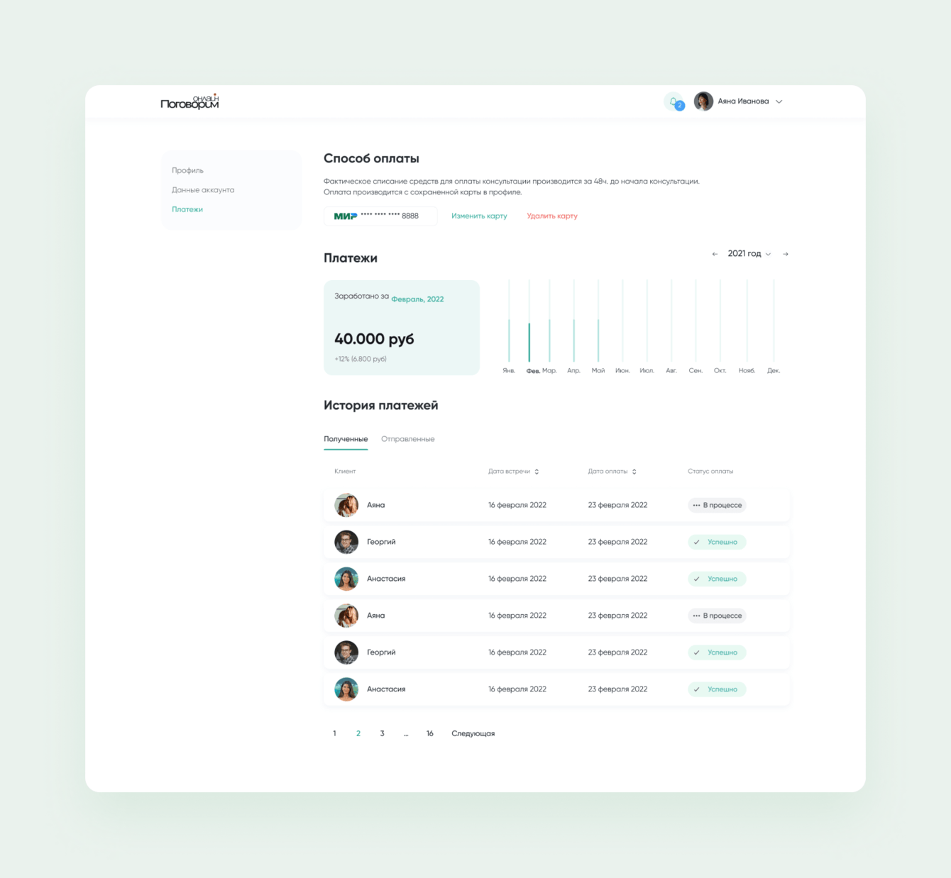 Проблем с реализацией приема платежей почти не было: мы уже отработали логику на другом сервисе онлайн-психотерапии для заказчика из Англии.