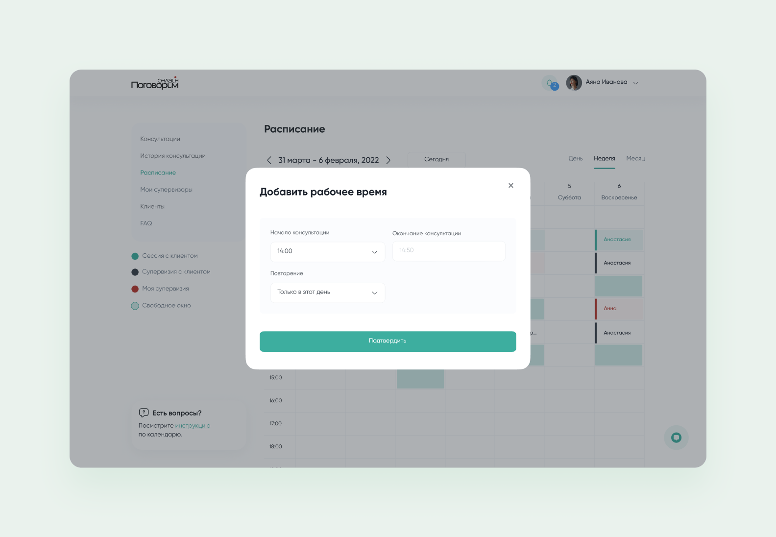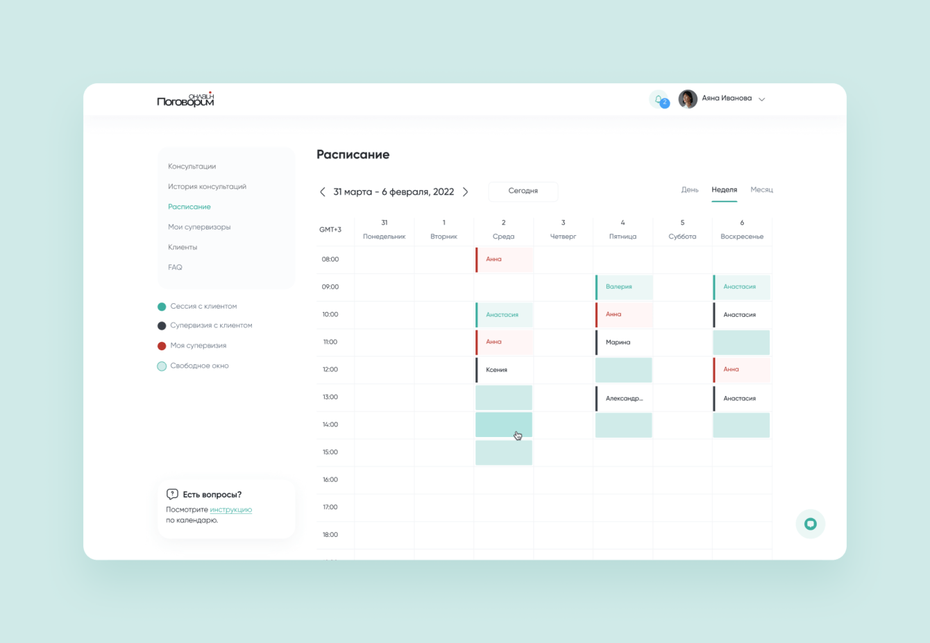 Цветовая навигация. Слоты в календаре подсвечиваются разными цветами по своей тематике: сессия с клиентом или свободное окно. Благодаря этому нюансу в интерфейсе проще разобраться.