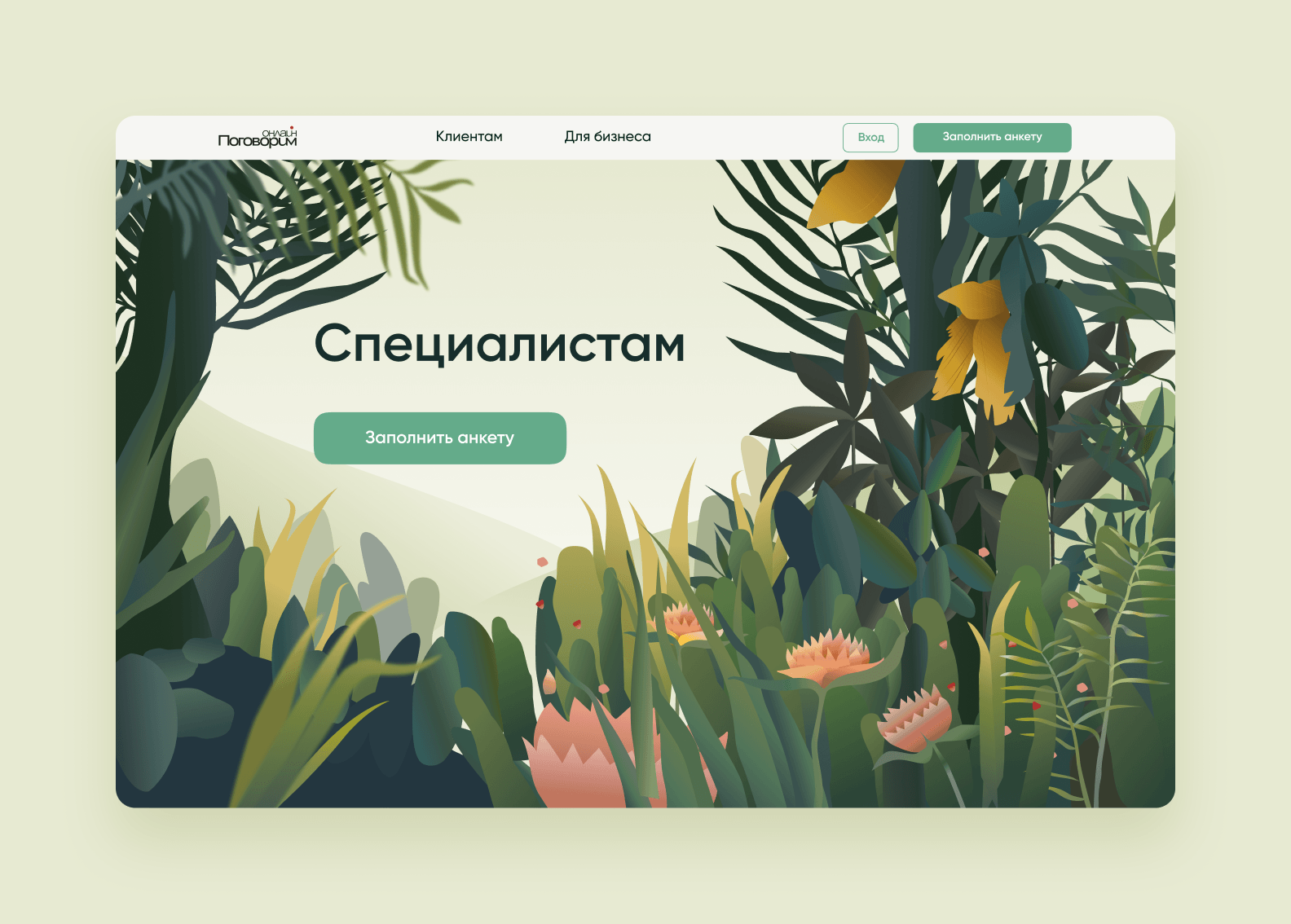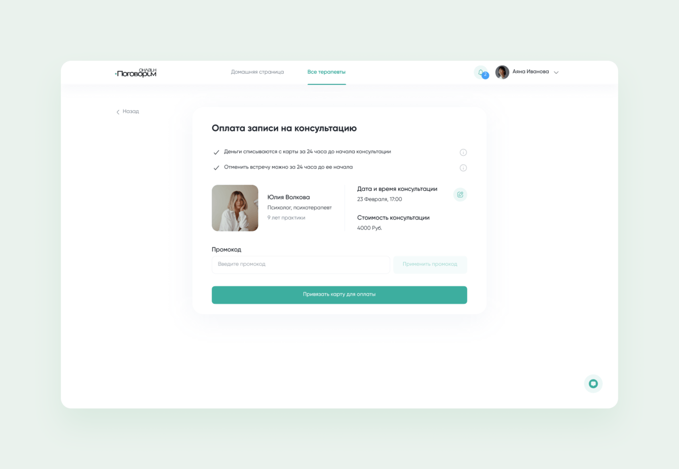 Один экран = одна большая зелёная кнопка. Это одно из главных правил в дизайне «Поговорим. онлайн». Так, пользователь сразу видит, куда ему нужно нажать, чтобы записаться на консультацию или оплатить сессию.