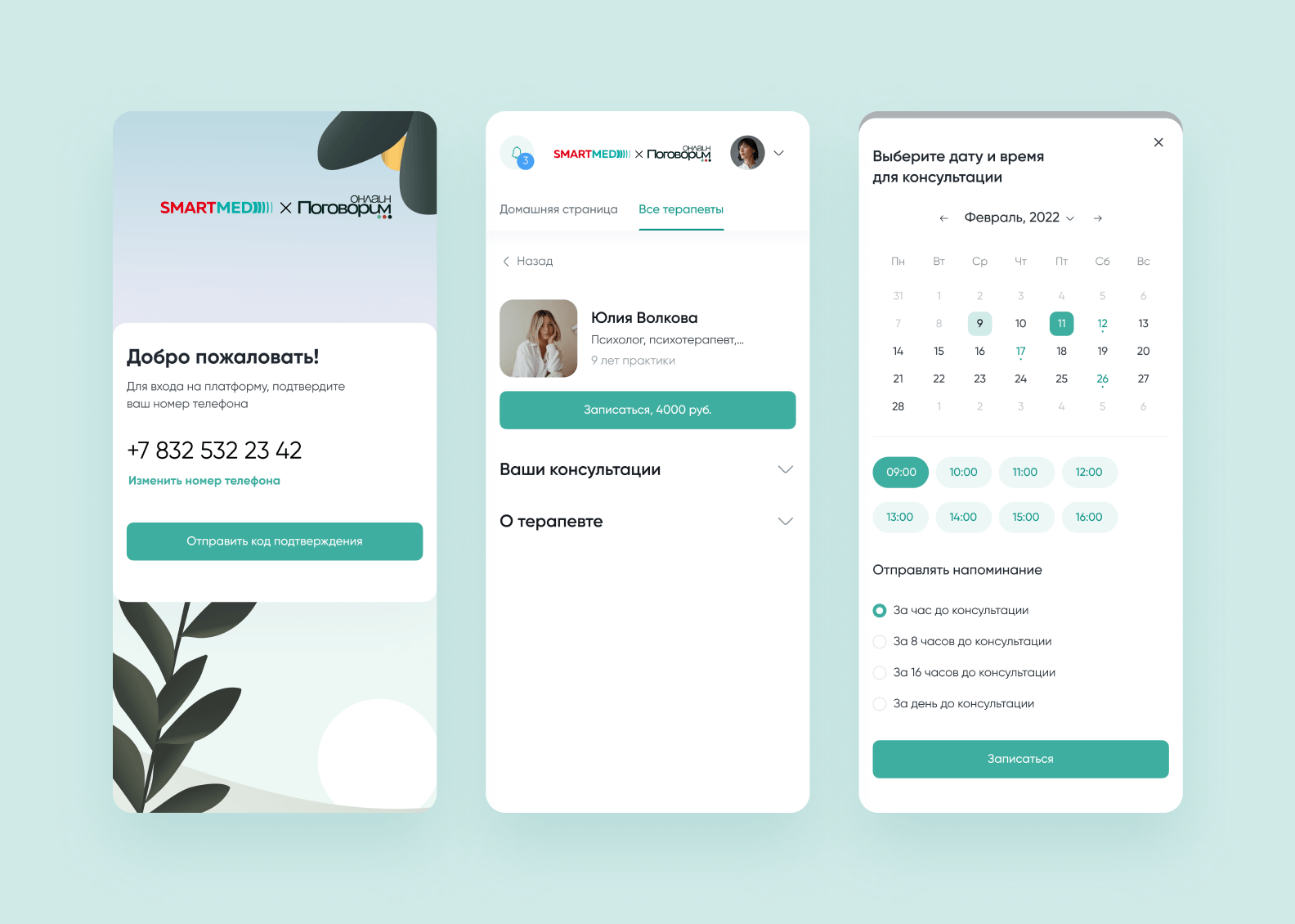 - Задизайнили экраны для трех разных точек входа: клиент, терапевт и бизнес