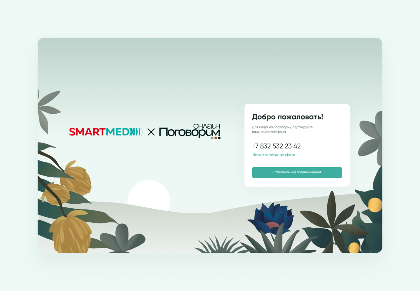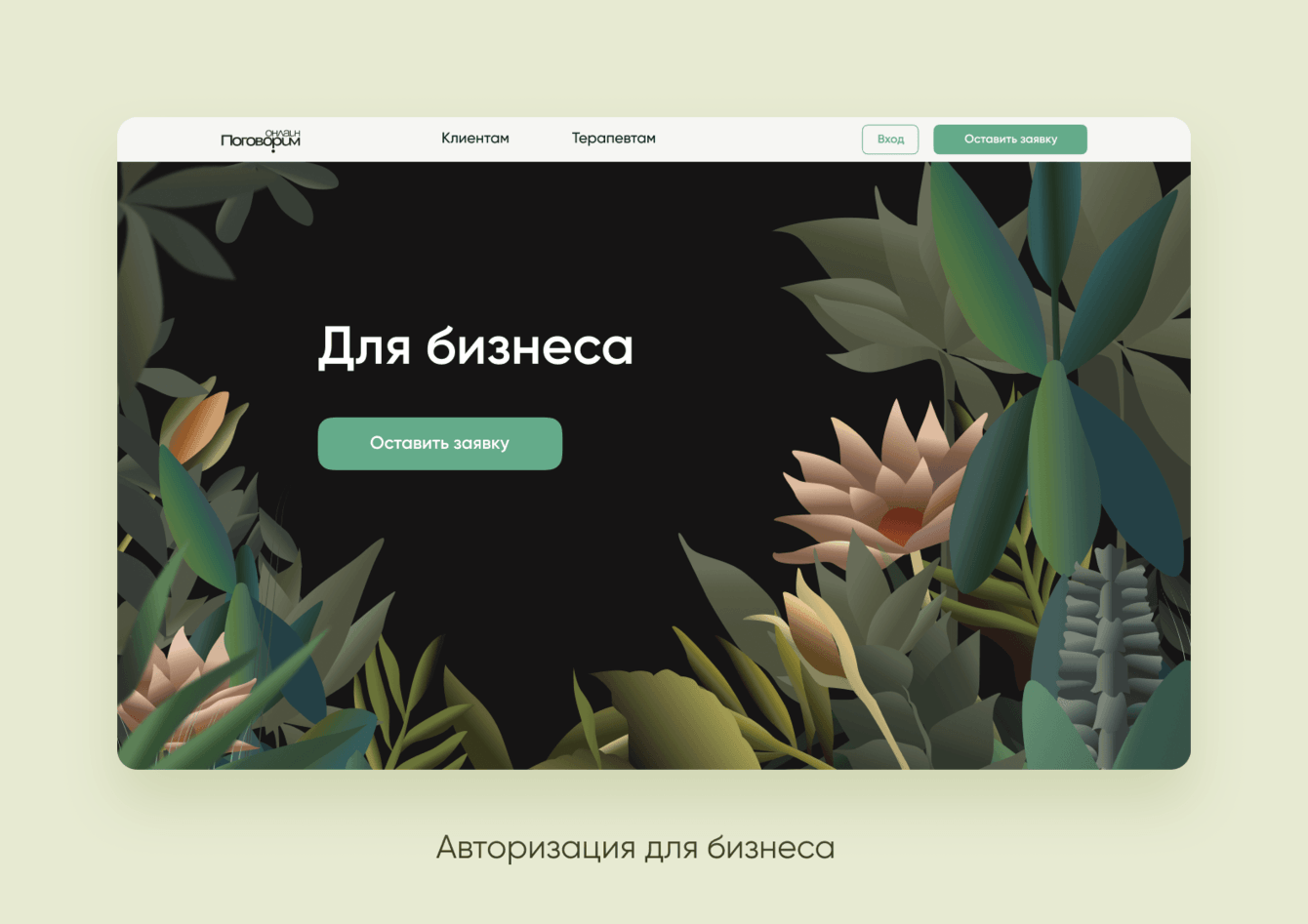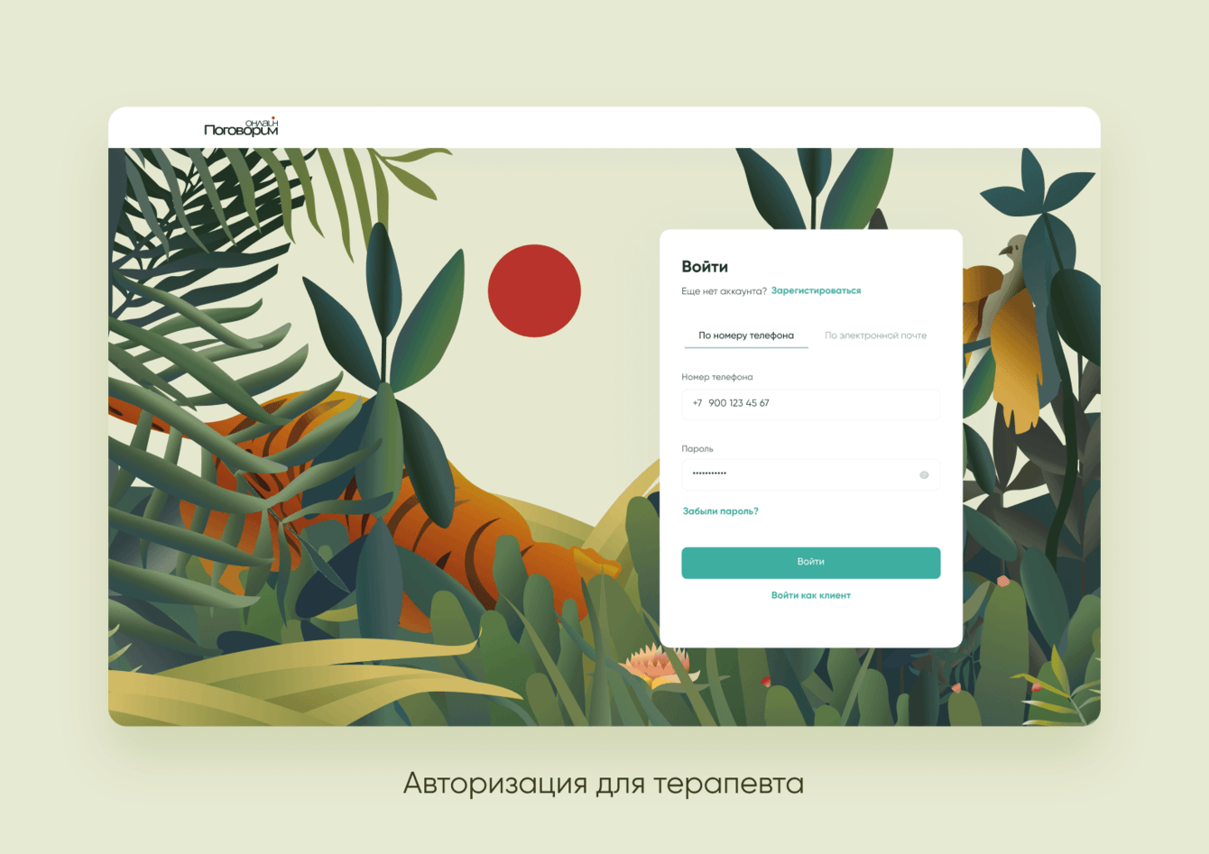 В сервисе «Поговорим.онлайн» у пользователя есть три точки входа: клиент, терапевт и бизнес. Для каждой из этих ролей платформа визуально выглядит по-разному, хотя и соединена общей концепцией. Заказчик предложил отразить это в дизайне еще на этапе авторизации. И мы сделали экраны с тремя разными иллюстрациями — использовали полноценные картины, созданные дизайн-агентством.