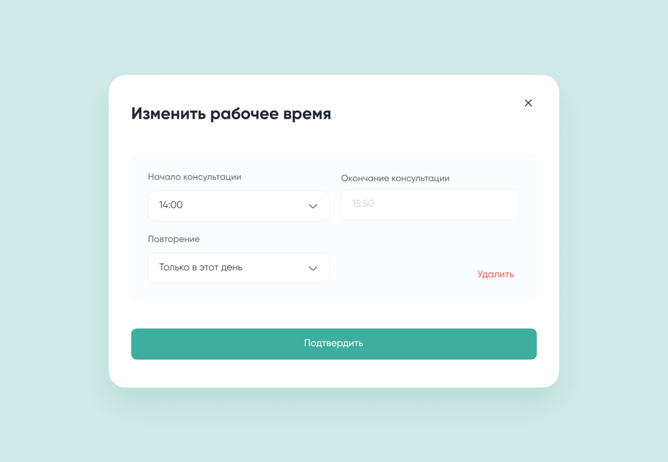Бронь временных промежутков. Терапевту не надо бронировать в календаре все временные слоты вручную. Он может задать промежуток: например, с 12 до 18 часов. Время автоматически разобьется на интервалы по 55 минут. 5 минут — это стандартный перерыв.