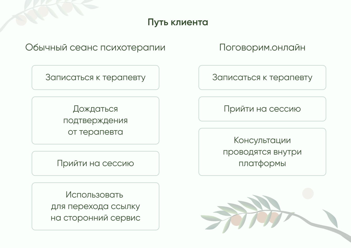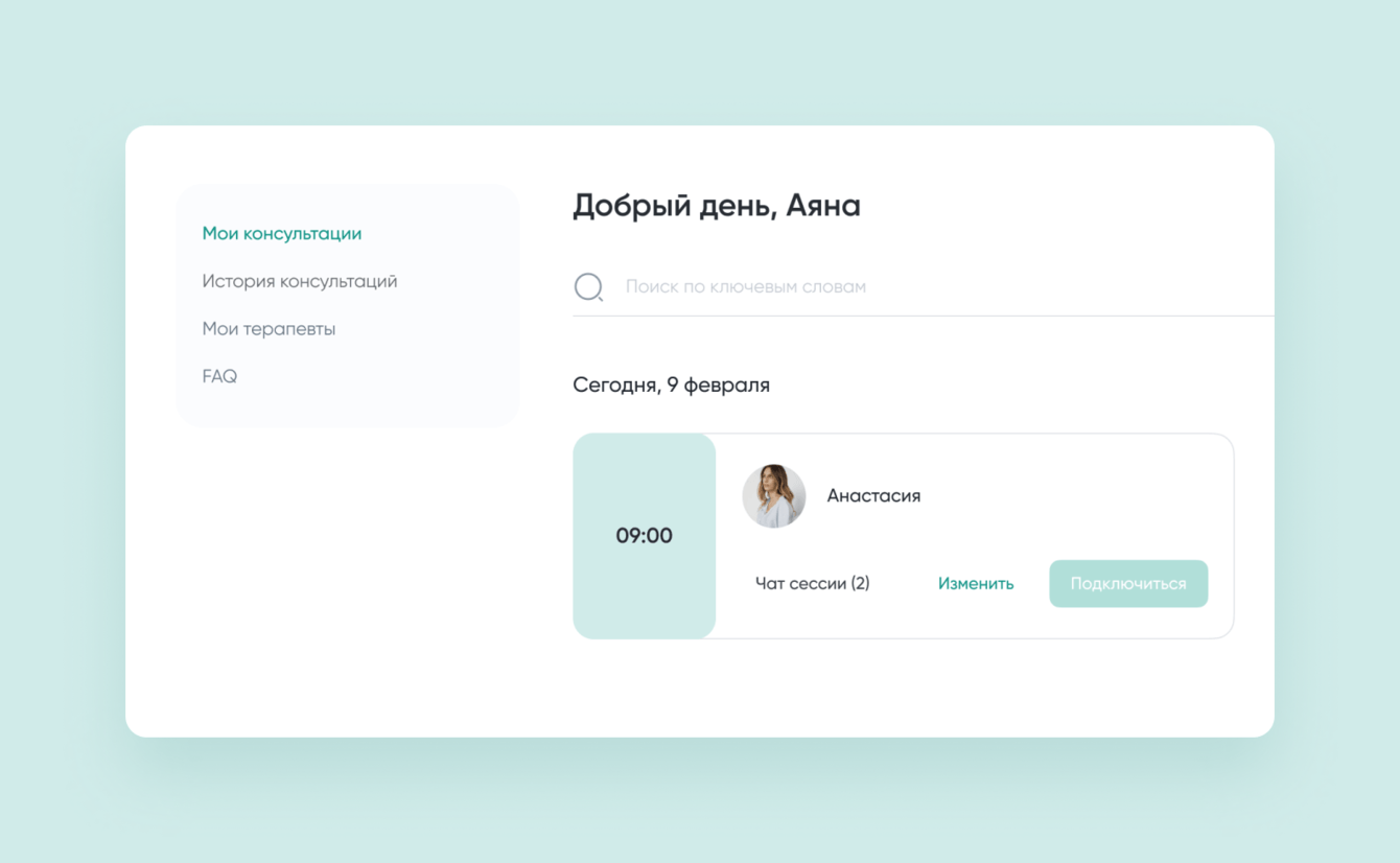 - Создать максимально простой интерфейс для сервиса, в котором одинаково легко разберется клиент и терапевт