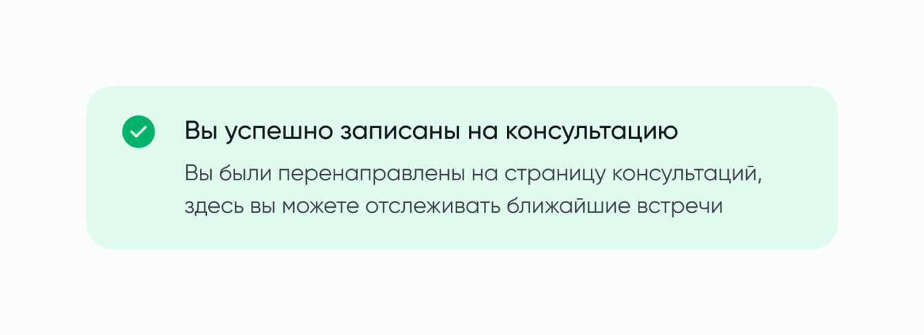 Обратная связь. Когда пользователь записывается на сессию или отменяет ее, в правом нижнем углу ему приходит уведомление о том, что всё прошло успешно. Это важно, чтобы клиенту не надо было перепроверять в календаре, получилось ли выполнить то или иное действие. Сервис моментально выдает яркий визуальный отклик.