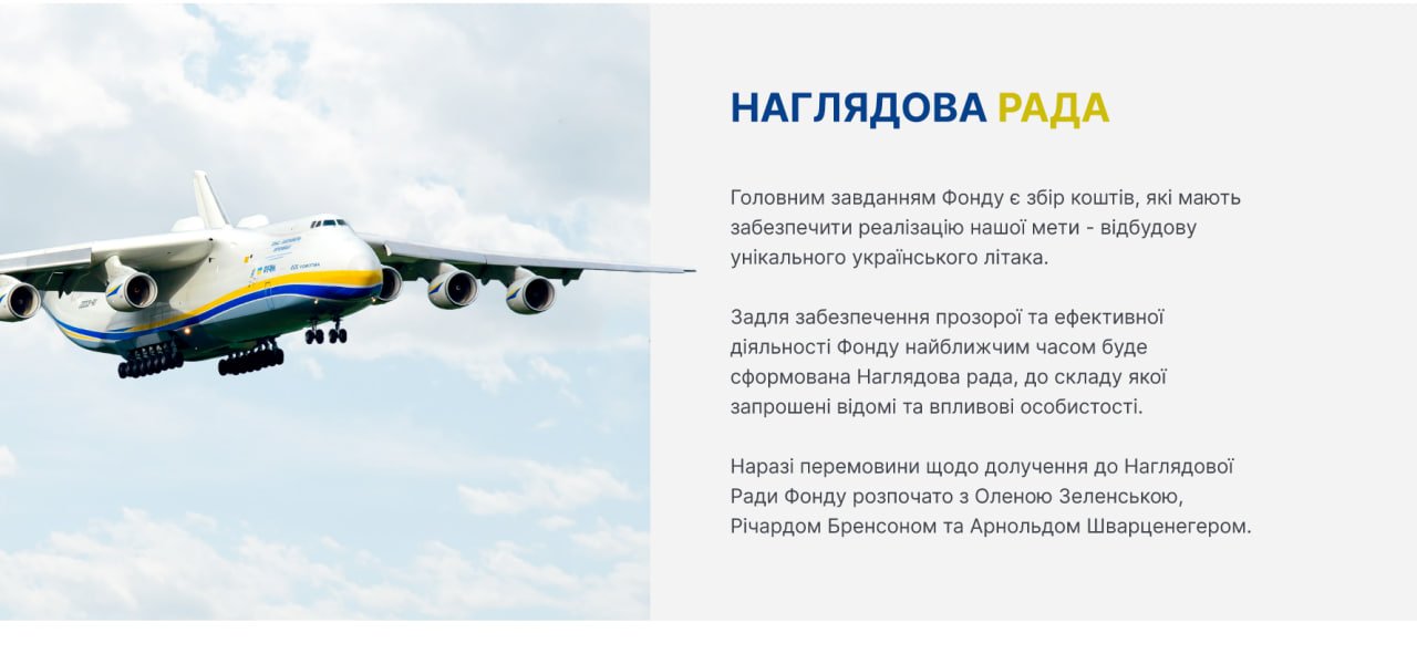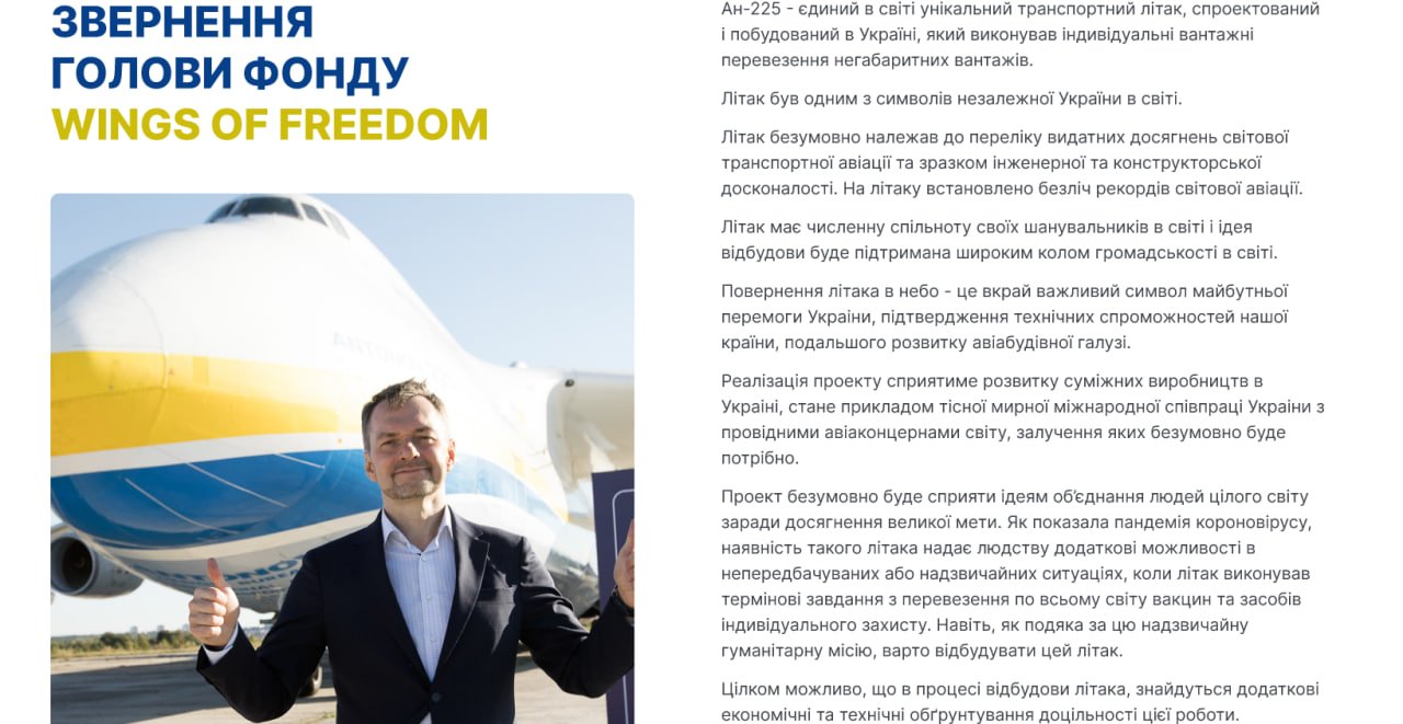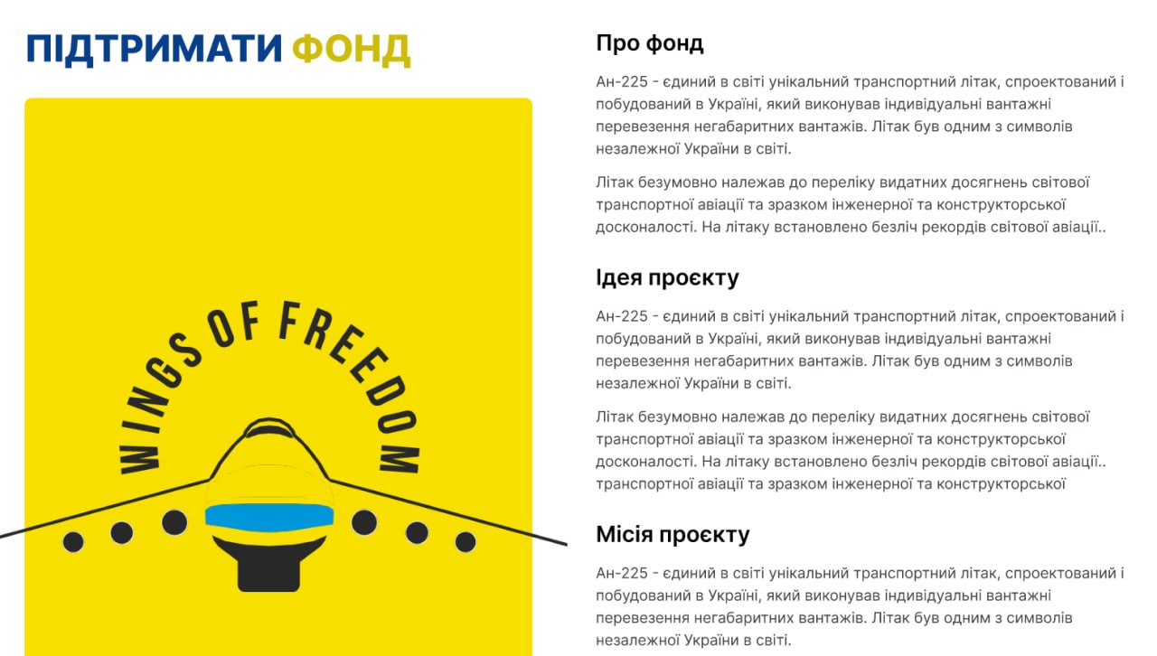 **«Проект восстановления АН-225 — это не просто история про самолёт, это история про нацию, про веру, про силу. Команда [название вашей компании] с первых дней точно уловила наш посыл и воплотила его в мощной, вдохновляющей цифровой форме. От дизайна до структуры — всё говорит о профессионализме и глубоком погружении в суть.