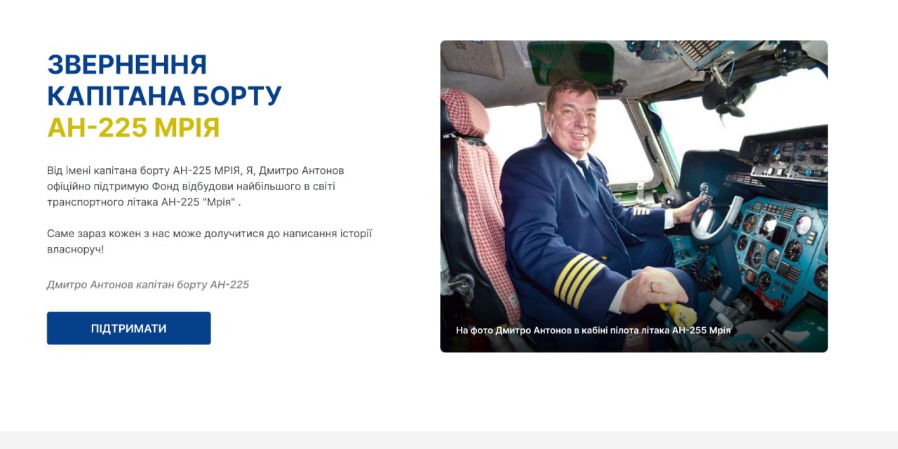 Разработка информационно-презентационного сайта для сбора средств и популяризации проекта восстановления транспортного самолета АН-225 «Мрія». Сайт должен рассказать об уникальности самолета, донести миссию проекта, включать официальную поддержку капитана, и содержать призыв к действию — поддержке фонда.