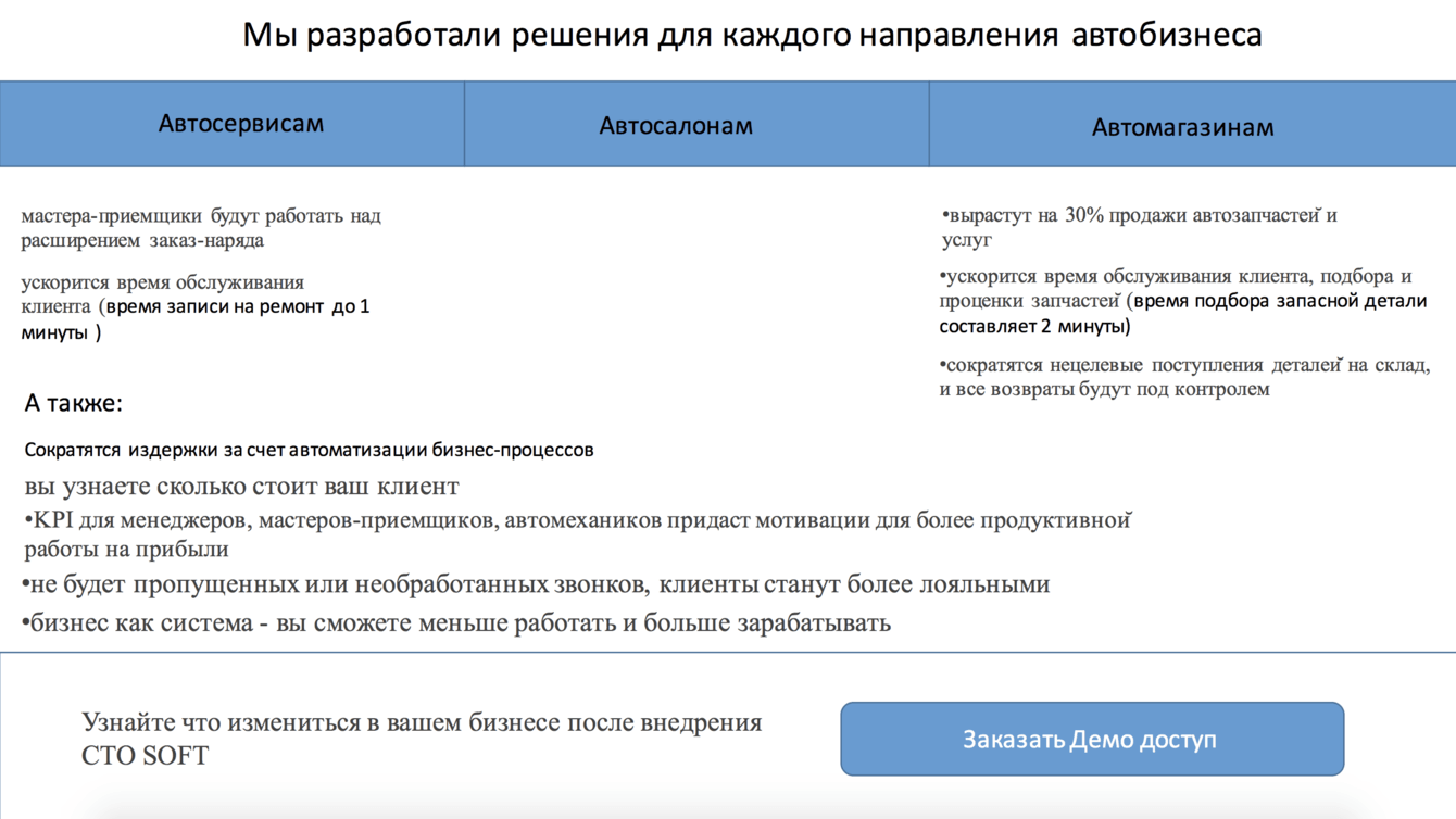 Ключевое, что дало результат - это оффер на первом экране, совпадающий с запросом целевой аудитории, и ключевое действие "Заказать Демо-доступ" продукта.