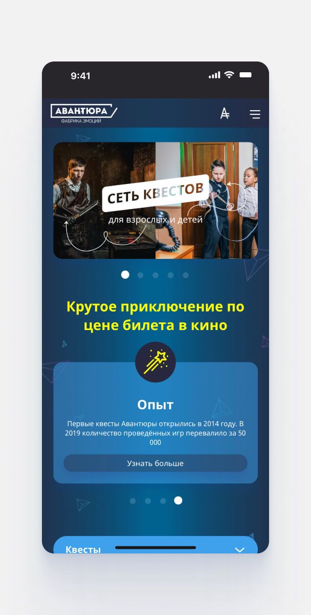 Авантюра — знаменитая компания по организации квестов в Екатеринбурге: более 20 квестов, 4 перформанса, приключения всех жанров для детей и взрослых. Компания стремительно развивается, за шесть лет она присоединила к себе такие крупные площадки, как Клаустрофобия и Территория, и заняла лидирующие позиции среди конкурентов.