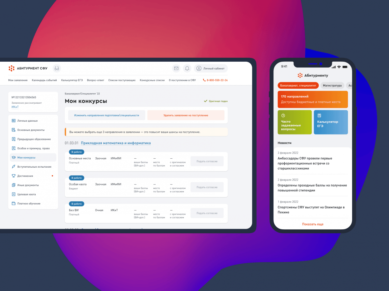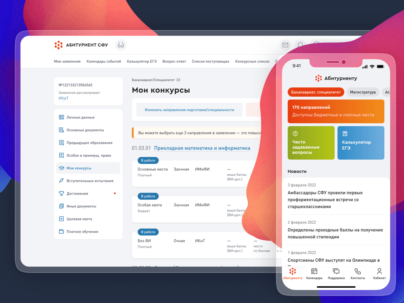 Чтобы пользоваться информационной системой СФУ было удобнее, мы разработали кроссплатформенное мобильное приложение для абитуриентов. В нем доступен весь необходимый поступающим функционал: