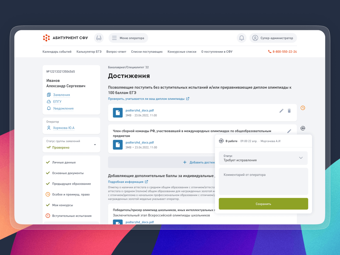 Обычно в приемной кампании СФУ участвуют около 300 операторов. Они принимают заявления, консультируют абитуриентов и выполняют всю работу, связанную с приемной кампанией. Мы погрузились в эти процессы и разработали личный кабинет оператора, в котором можно:
