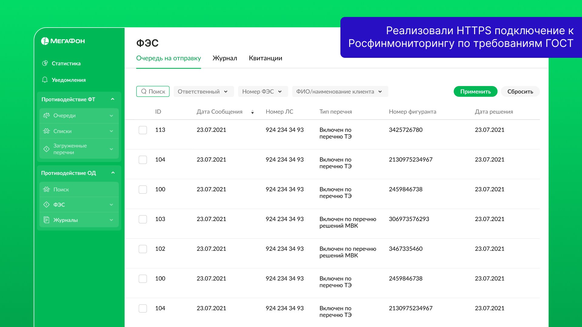 QSOFT создали веб-приложение для сокращения ручного труда операторов при исполнении требований Федерального закона №115-ФЗ от 07.08.2001 года «О противодействии легализации (отмыванию) доходов, полученных преступным путем, и финансированию терроризма». Теперь оператор сотовой связи имеет возможность в автоматизированном режиме отправлять данные, необходимые для отчетности перед государственными органами, в Росфинмониторинг. На следующем этапе реализации проекта система будет тиражирована на дочернюю компанию ПАО «МегаФон» – Yota.