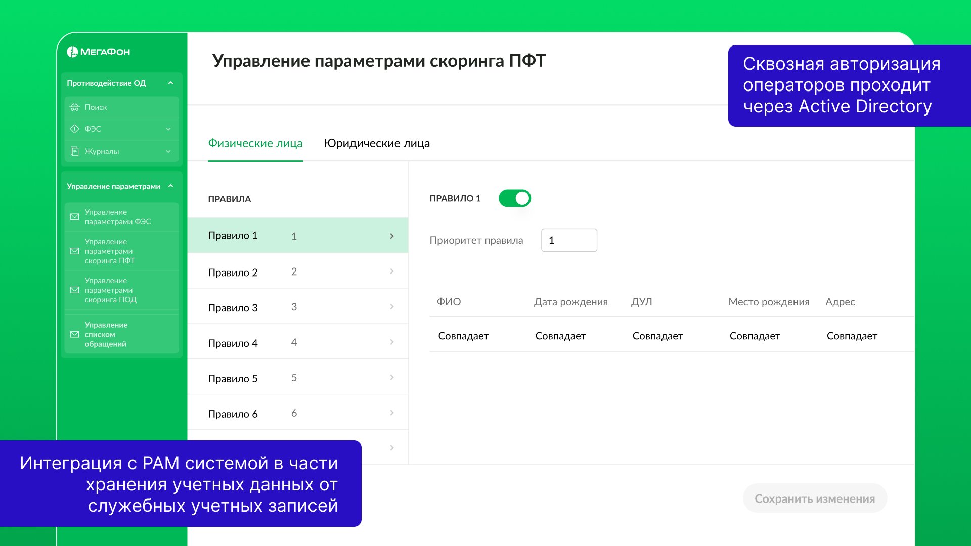 Первоначально QSOFT внедрил функционал MVP, реализовав функционал скоринга данных и базовую логику системы. Информация бралась из внутренних систем заказчика: мобильной коммерции, биллинга и подписок на VASP (поставщиков услуг в отношении виртуальных активов). Отметим, что при разработке учитывался ежедневный объем изменения данных ПАО «МегаФон» и дочерних организаций, а также соблюдались требования в части безопасности и защиты персональной и конфиденциальной информации.