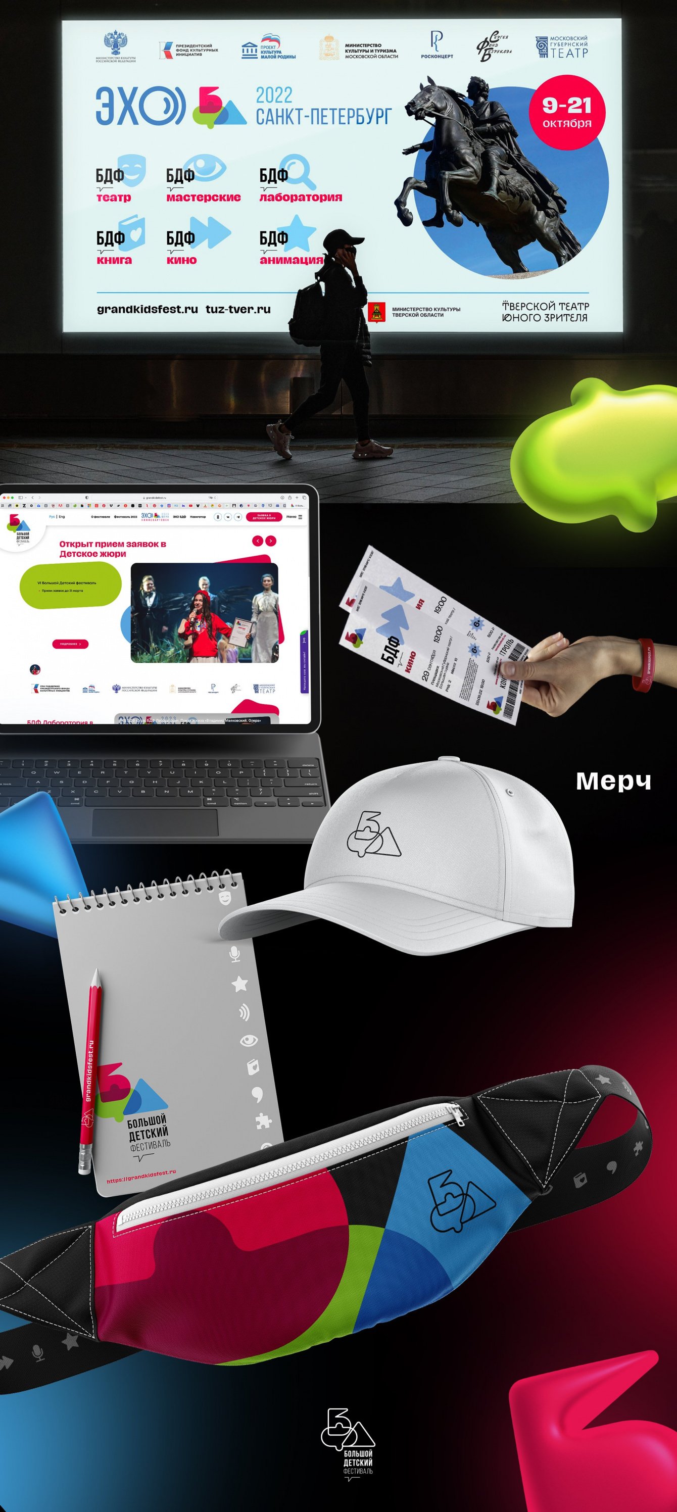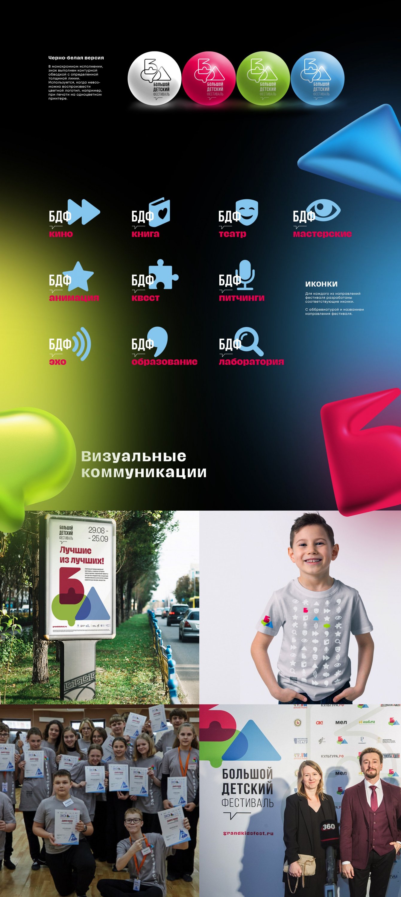 В визуальном образе мы искали решение, которое будет отражать тему театральности, изначальную основу фестиваля. Совместив образ разноцветных софитов которые освещают театральную сцену, c аббревиатурой фестиваля (БДФ), которую представили в виде отражений софитов на поверхности сцены. Дополнительно был разработан ряд иконок – которые отражают все направления фестиваля, на визуальном языке инфографики.