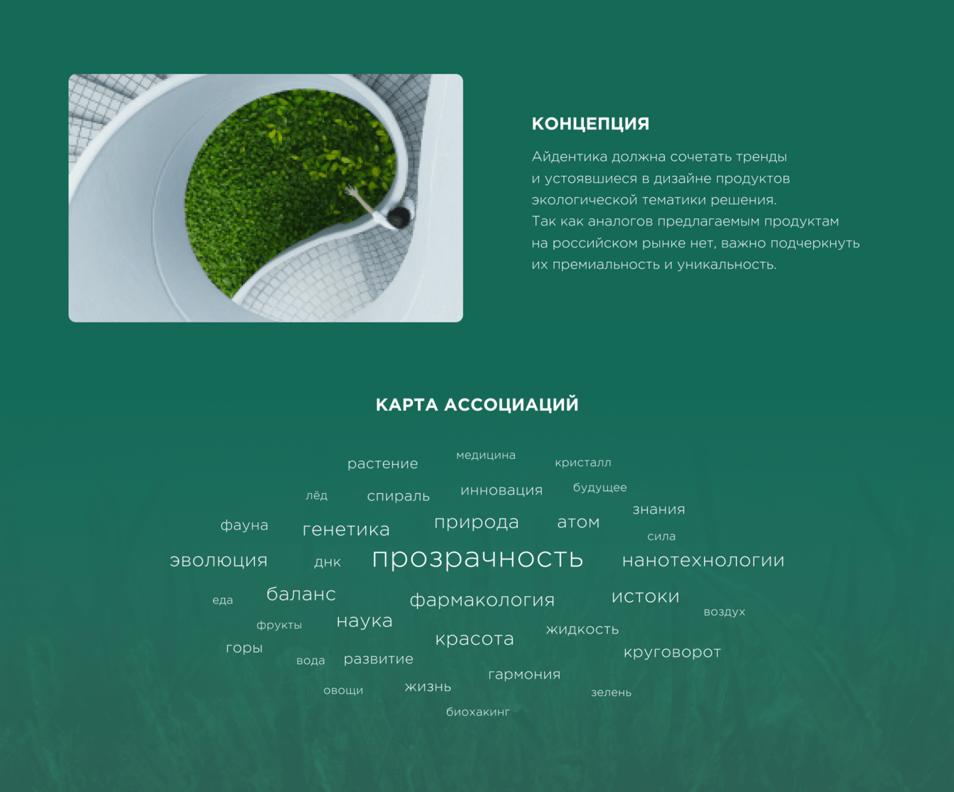 Айдентика сочетает в себе тренды, устоявшиеся в дизайне продуктов экологической тематики решения. Аналогов предлагаемым продуктам на российском рынке нет, таким образом, важно было подчеркнуть их премиальность и уникальность, что и было сделано.