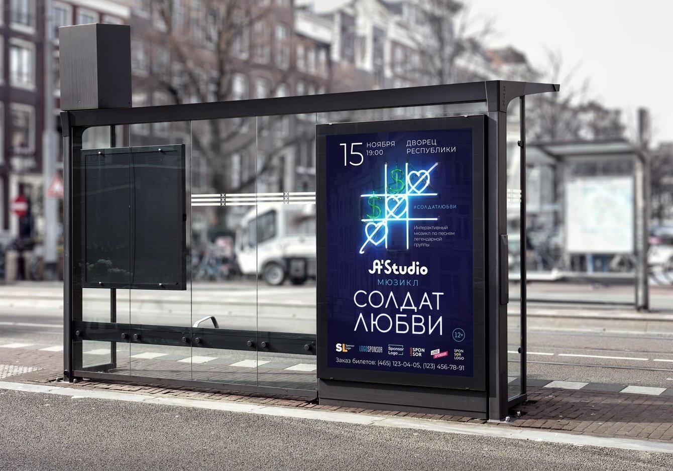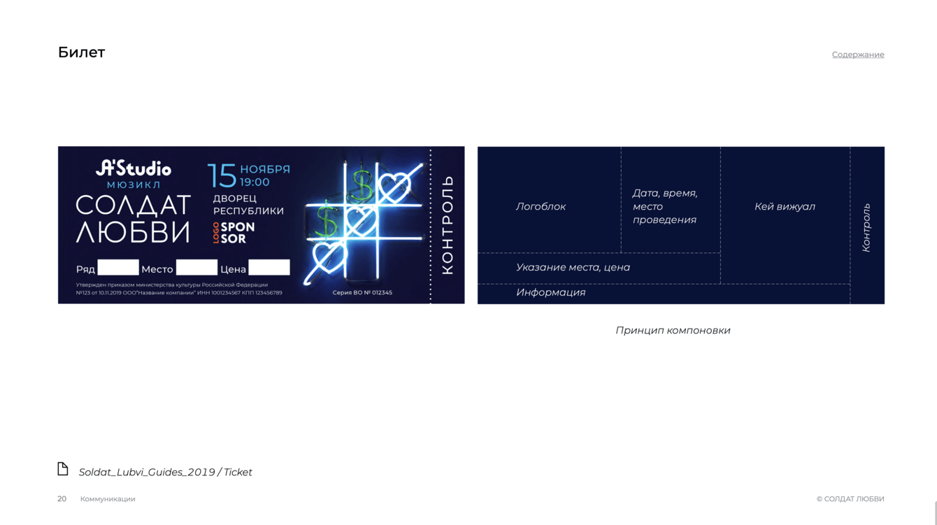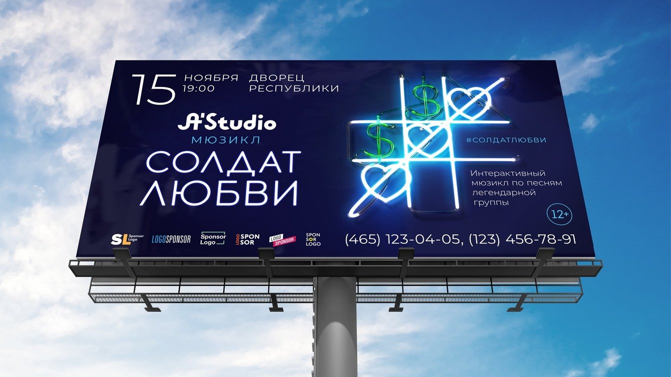 Разработать имиджевое визуальное решение и брендбук для мюзикла "СОЛДАТ УДАЧИ"
