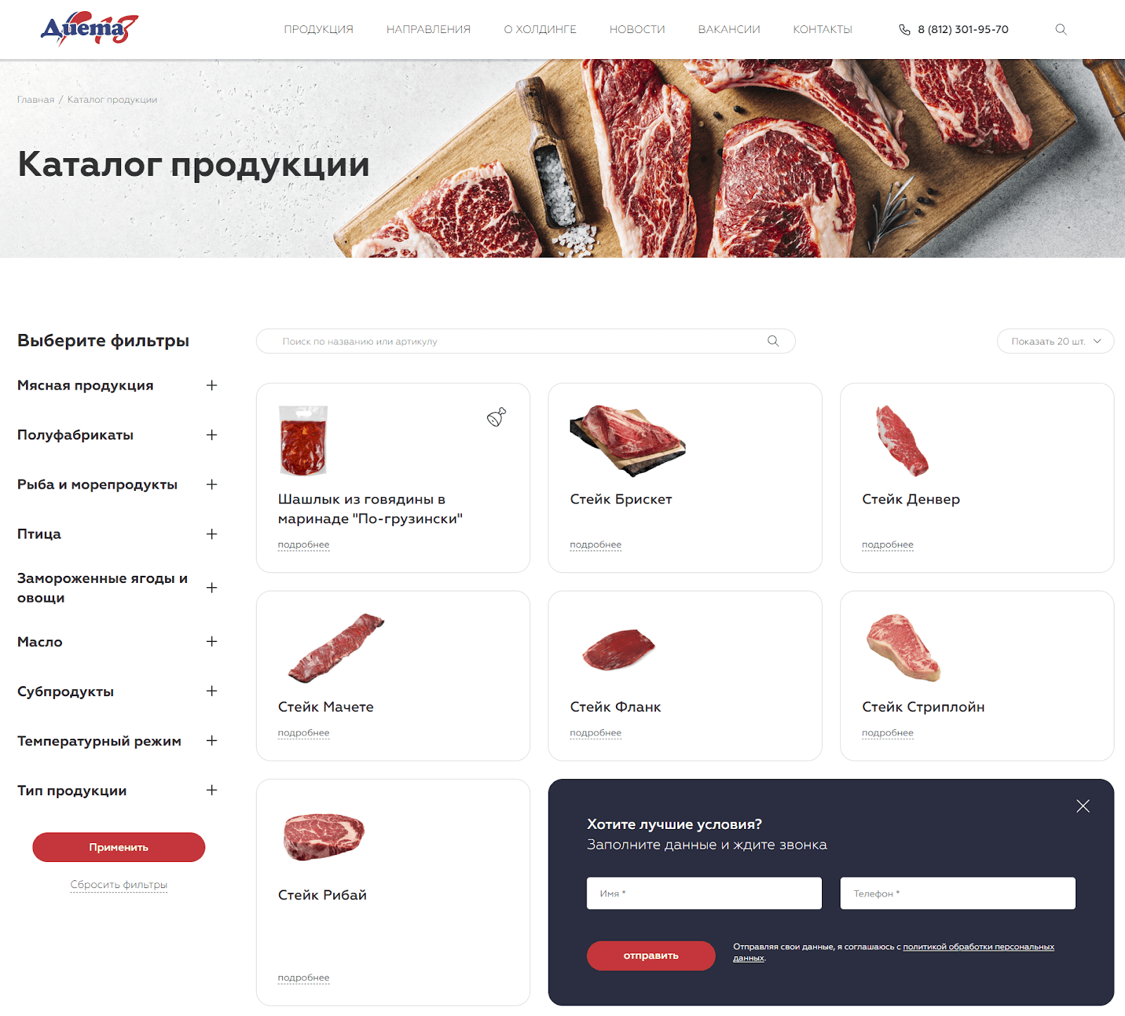 Каталог продукции был необходим, так как торговая деятельность – основная для заказчика. Изначально он планировался без фильтра: просто с переходами в соответствующий раздел. В итоге фильтр все же разработали, а также создали единую структуру для карточек товаров.