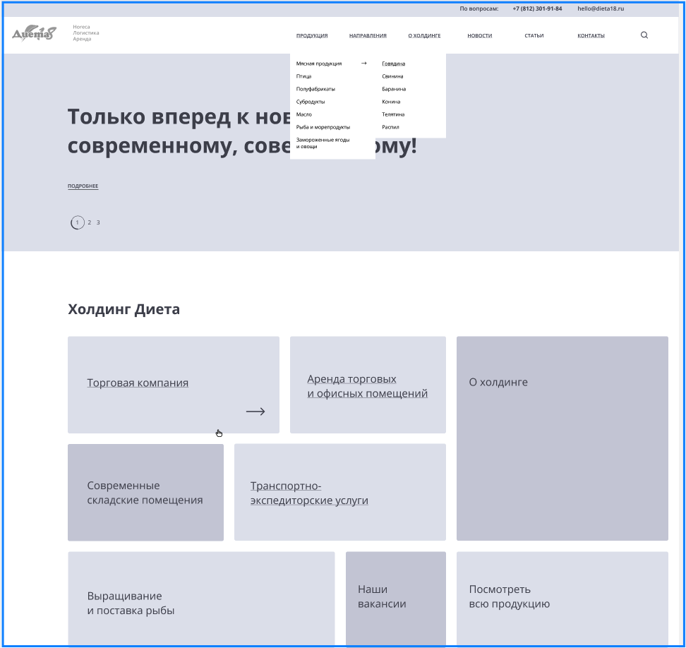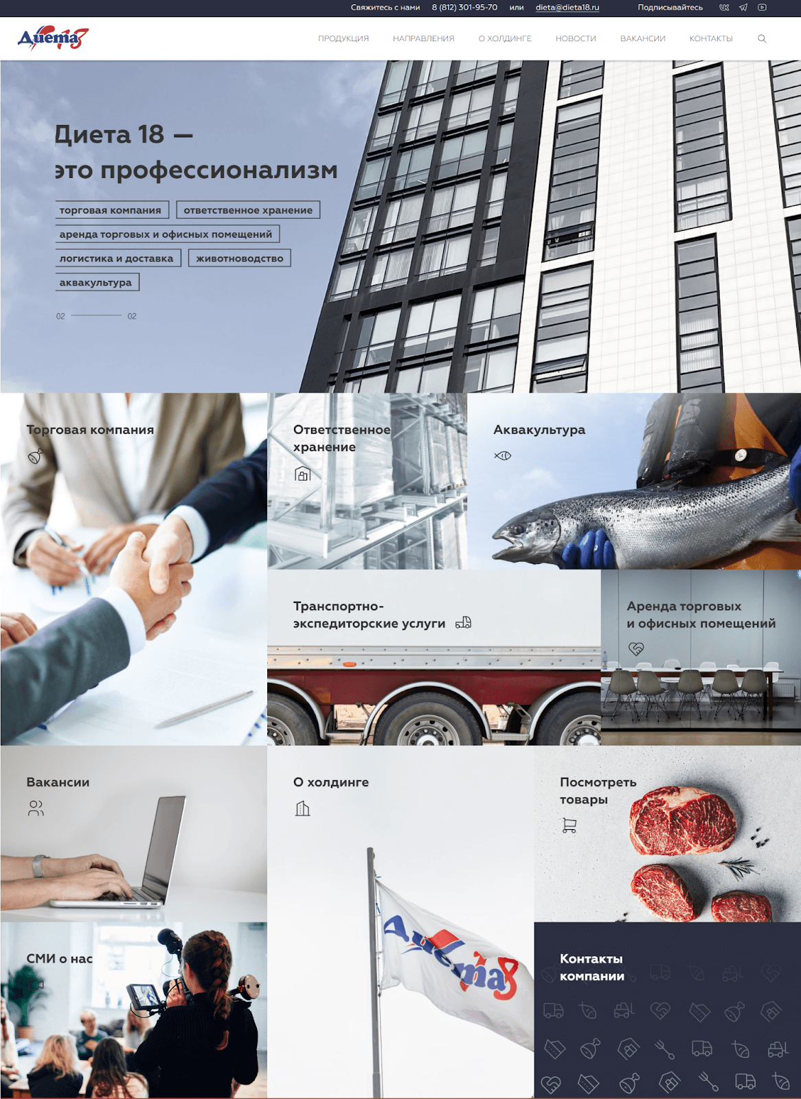 «Диета 18» – крупный импортер мясной продукции (топ-3 в РФ). Компания присутствует на рынке с 1993 года: тогда она занималась только торговой деятельностью. Поэтому прежний сайт был сфокусирован именно на этом направлении. В 1990-е и 2000-е началось развитие, у холдинга появились новые направления и услуги, не связанные с импортом мяса. Объединить их на одном сайте заказчику тогда не удалось: для каждого направления был создан отдельный сайт, а также простенькая общая визитка с кратким текстовым описанием видов деятельности, контактами и информацией о компании.