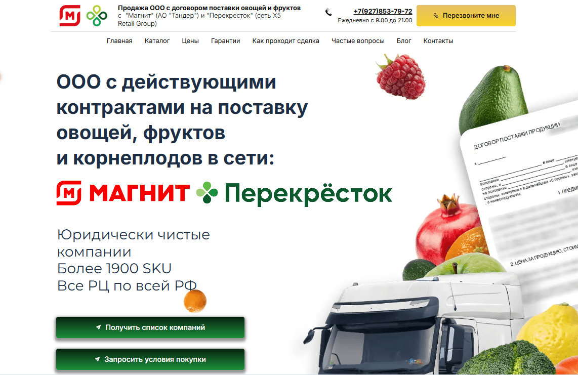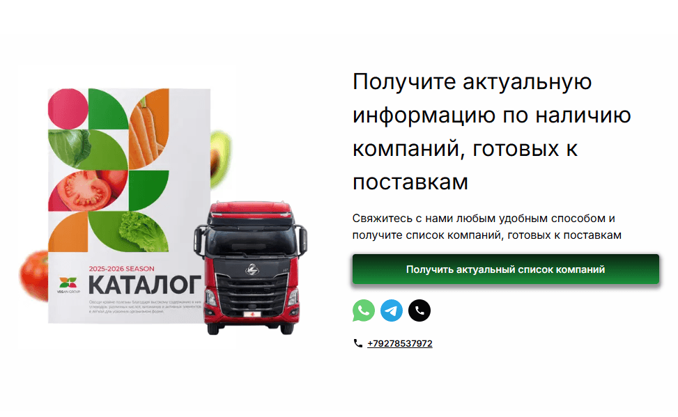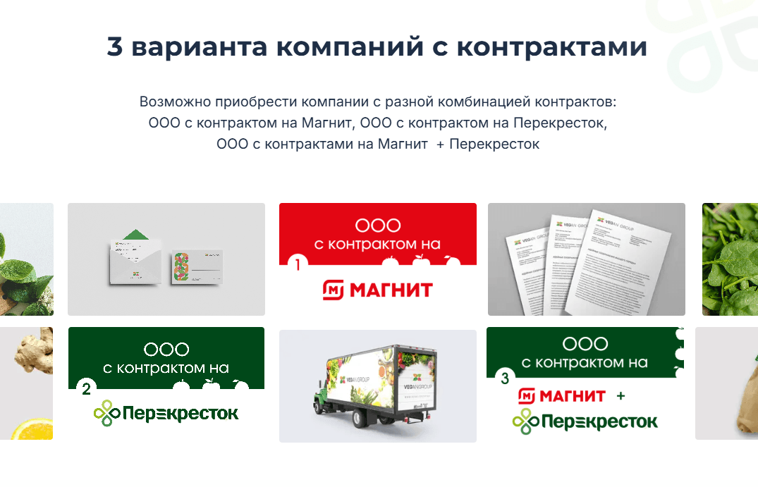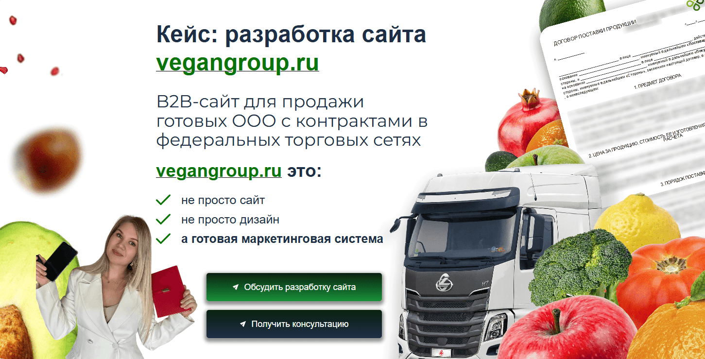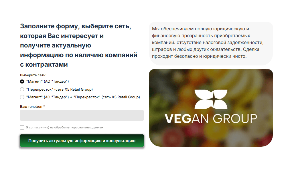 “ООО с действующими контрактами на поставку овощей и фруктов в сети: Магнит (АО «Тандер»), Перекрёсток (X5 Retail Group)” — это сильный месседж, который сразу снимает сомнения целевой аудитории. vegangroup.ru (https://vegangroup.ru/)