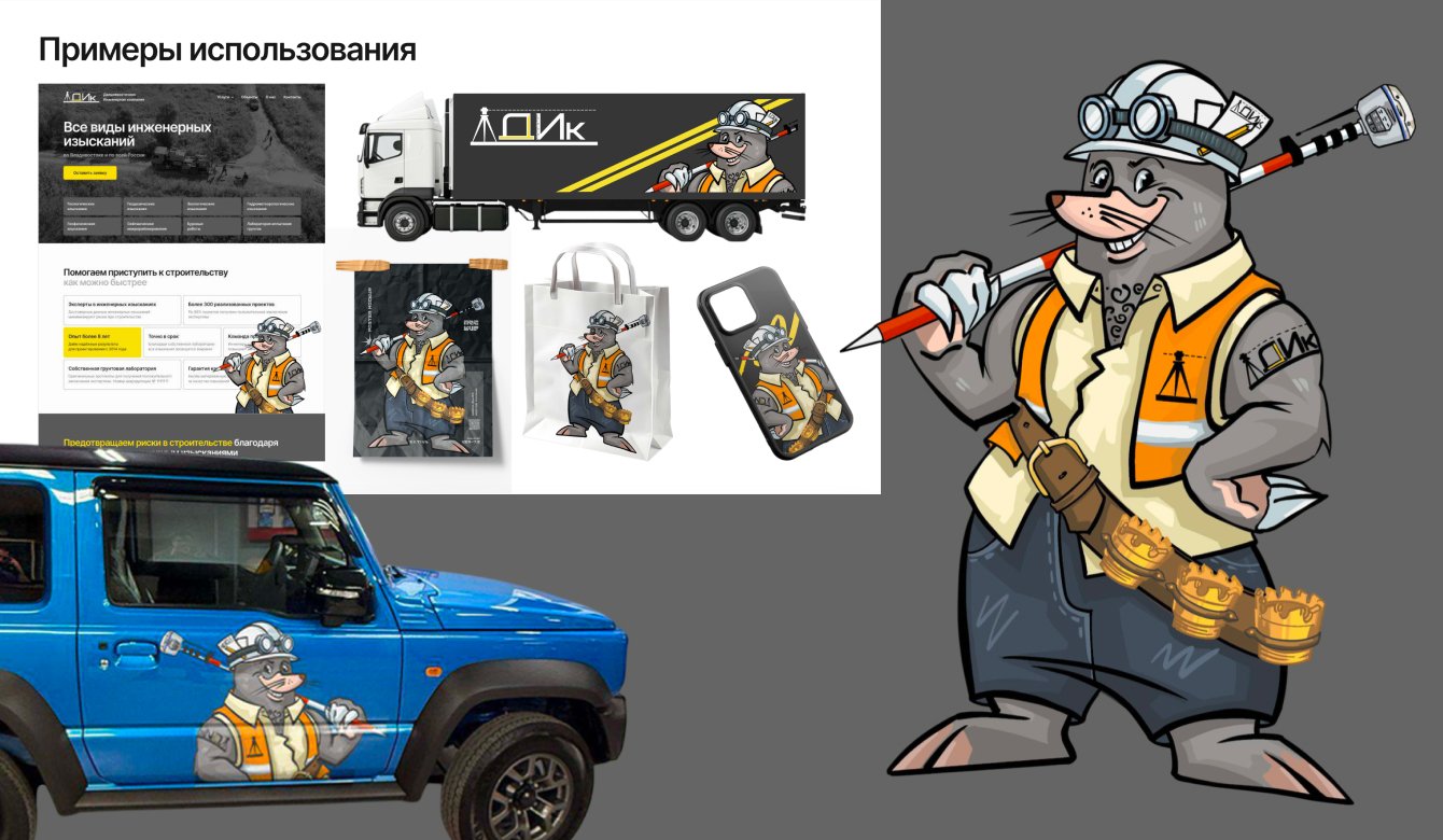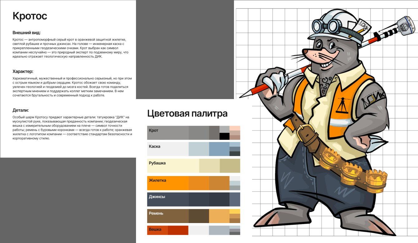 Утвержден итоговый образ: харизматичный инженер-крот с татуировкой «ДИК», геодезической вешкой на плече и энергичным, дружелюбным взглядом.