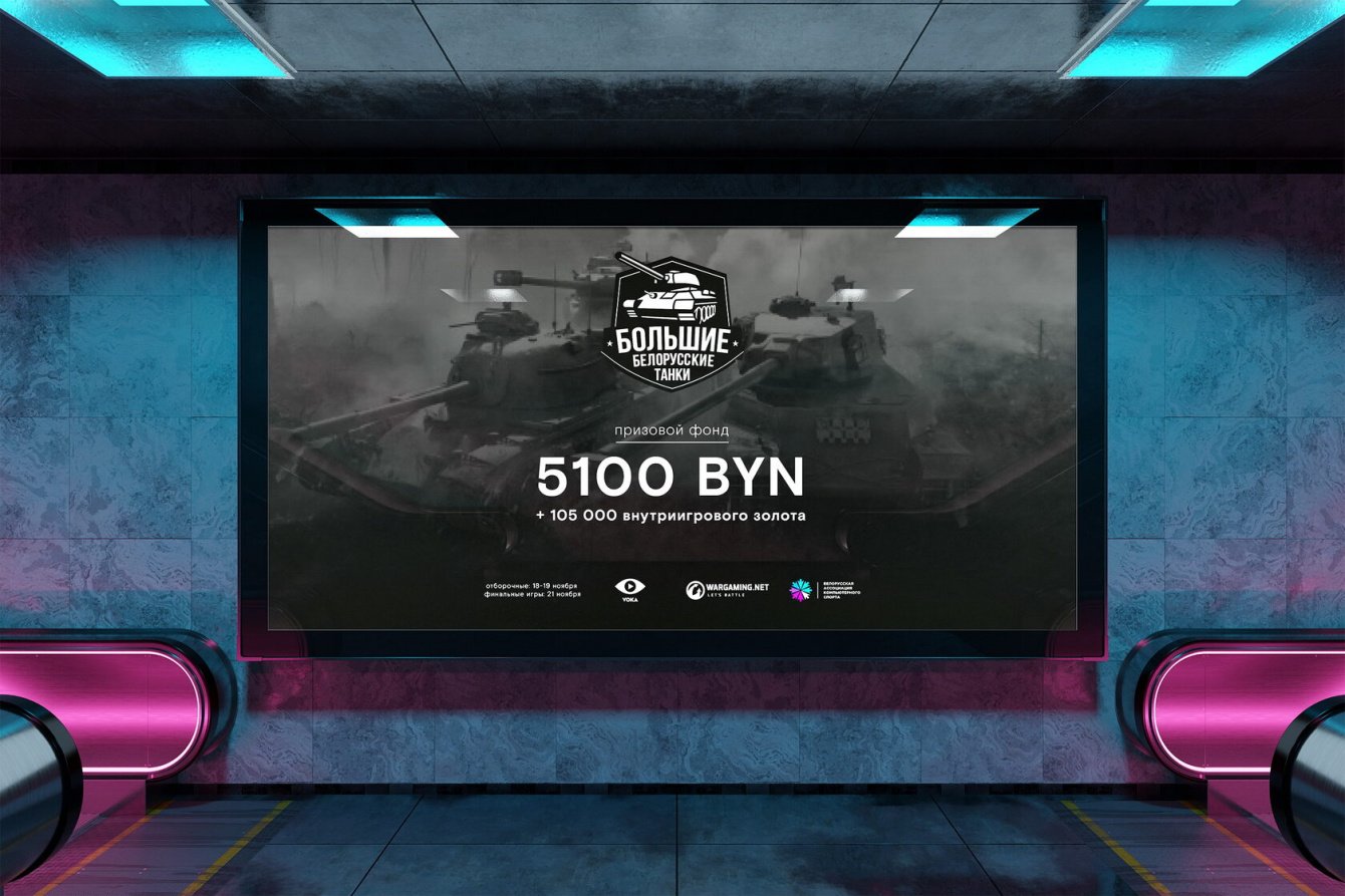 Для Больших Белорусских Танков мы разработали логотип-эмблему: контрастное монохромное изображение танка, вписанное в щит, что перекликается со стилем игры WoT.