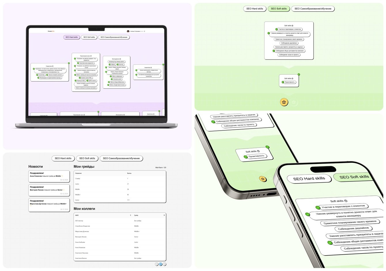 Система получилась визуально запоминающейся и интерактивной. У каждого сотрудника есть три основных раздела развития: Soft Skills, Hard Skills и Самообразование. Каждый из них разделен на уровни, где отображены ключевые навыки специалиста — от более базовых к сложным.
