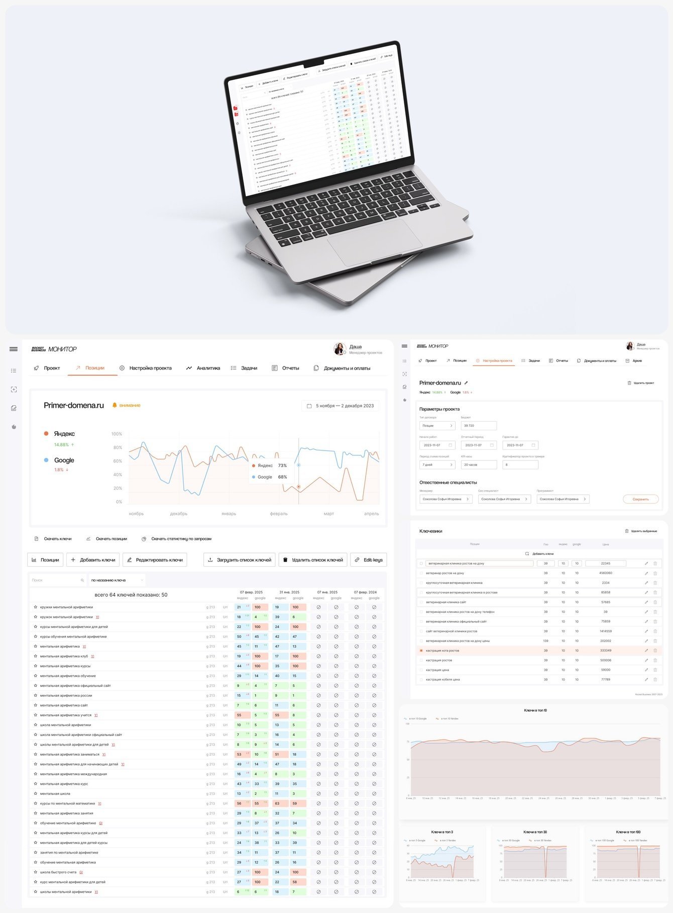 Rocket Business.Монитор — система для отслеживания позиций в выдаче, хранения информации по проектам, аналитике, отчетности по трудозатратам. Проект не для коммерции, а для эффективности команды и полной прозрачности нашей работы.