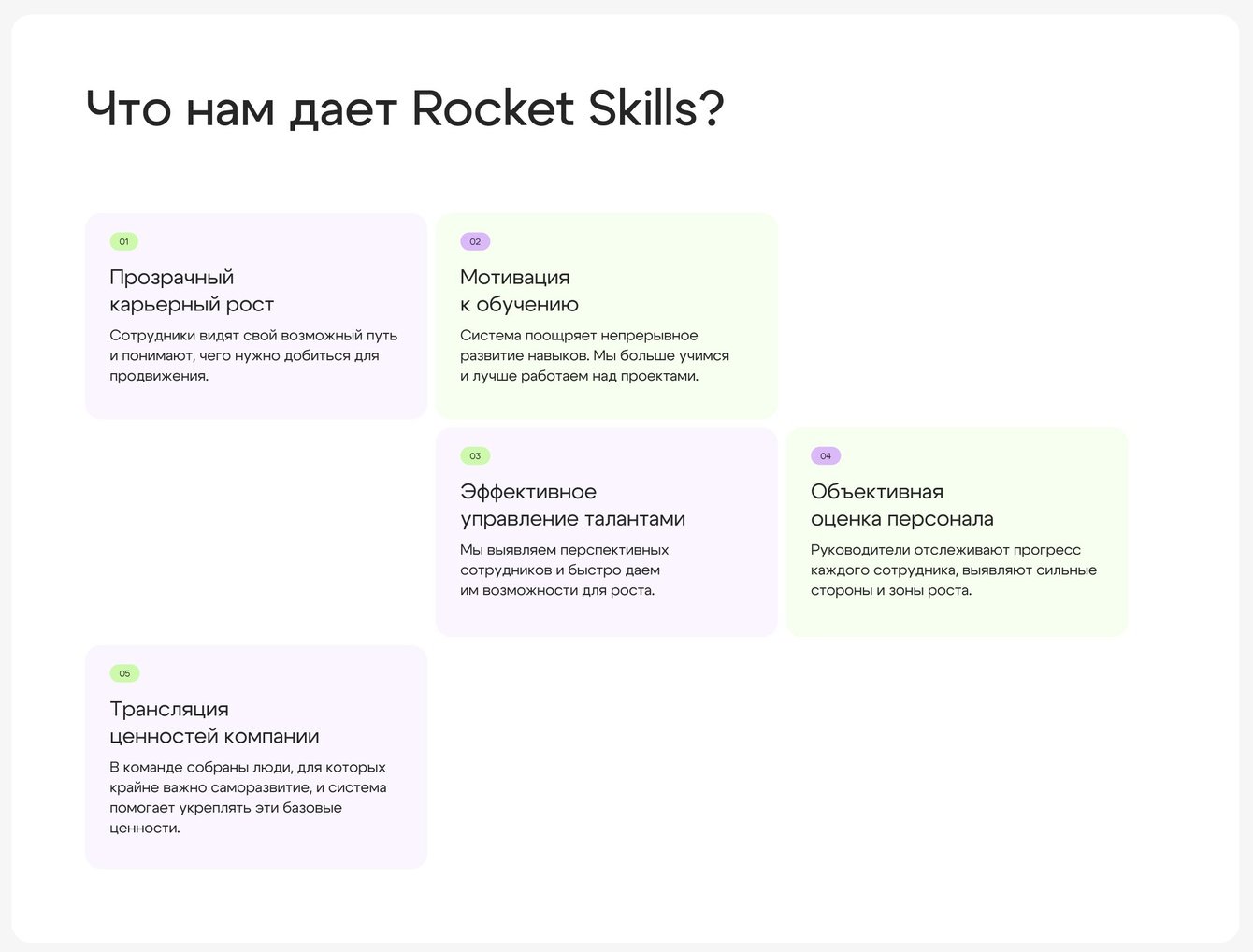 Rocket.Skills — внутренняя система, которая отслеживает достижения сотрудников, стимулирует обучение и визуализирует рост по карьерной лестнице.