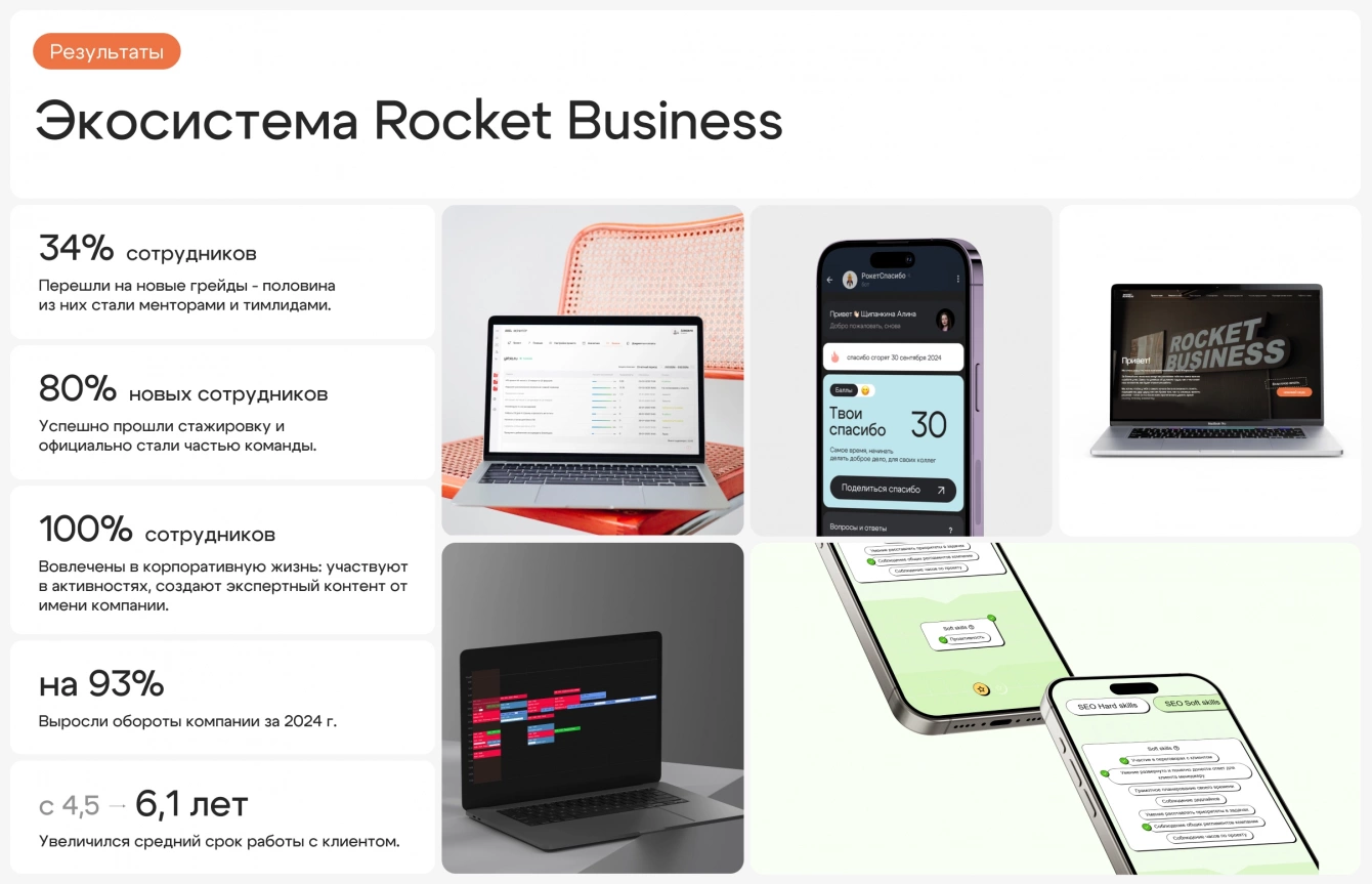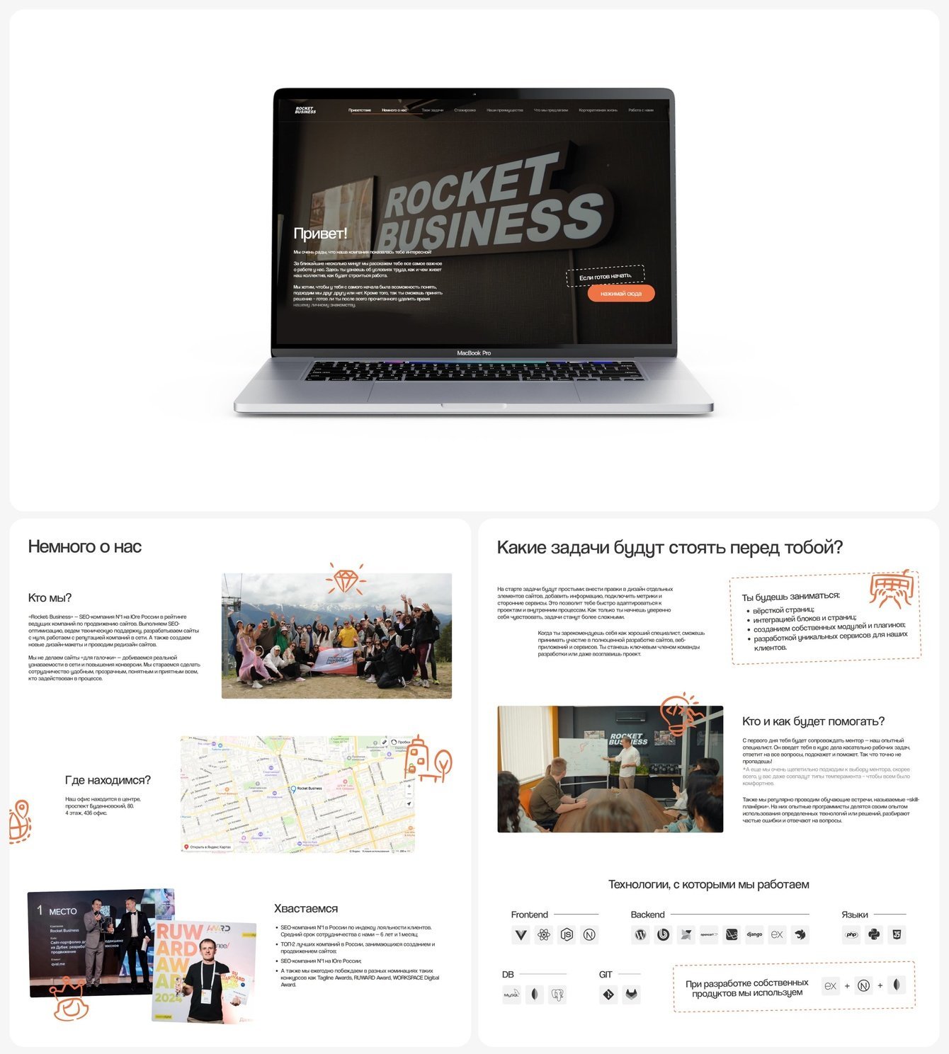 5. Повышение привлекательности компании как работодателя. Стильный дизайн, качественные фотографии и подробное описание нашей корпоративной культуры формируют положительное впечатление о Rocket Business и привлекают лучших кандидатов.