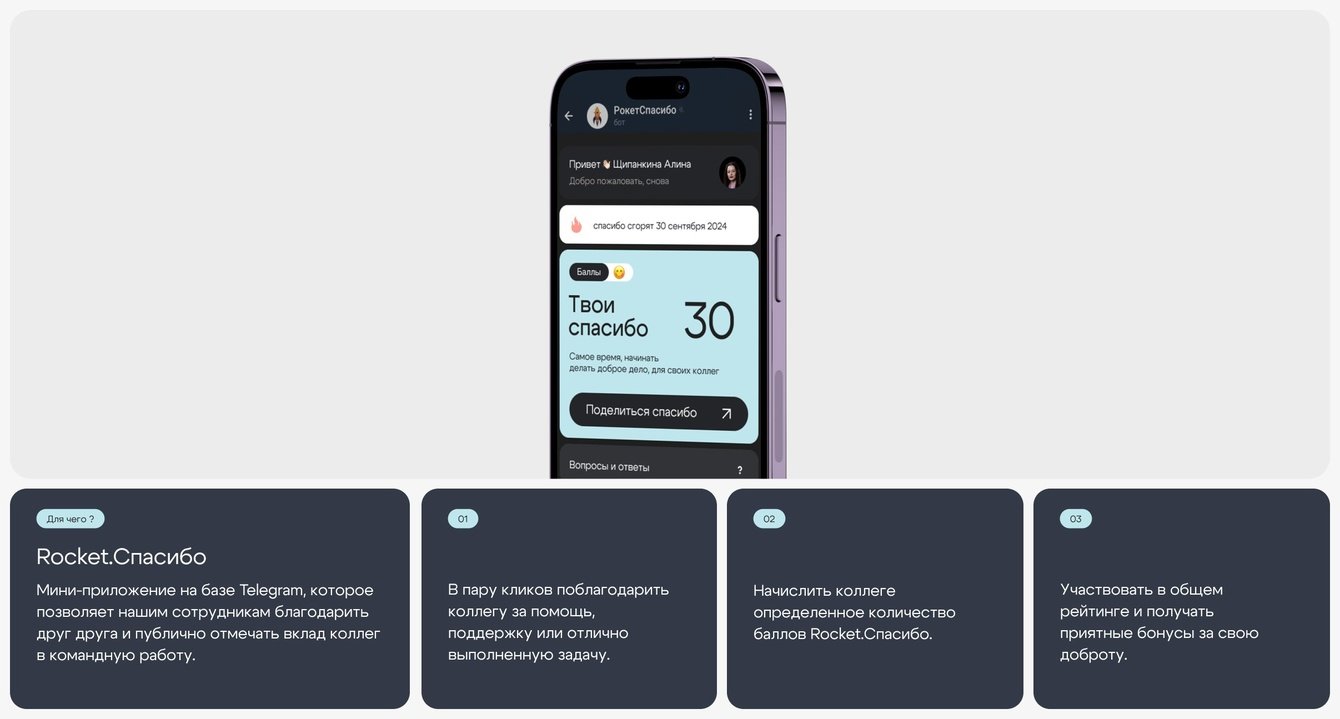 Rocket.Спасибо — мини-приложение на базе Telegram, которое позволяет нашим сотрудникам благодарить друг друга и публично отмечать вклад коллег в командную работу.