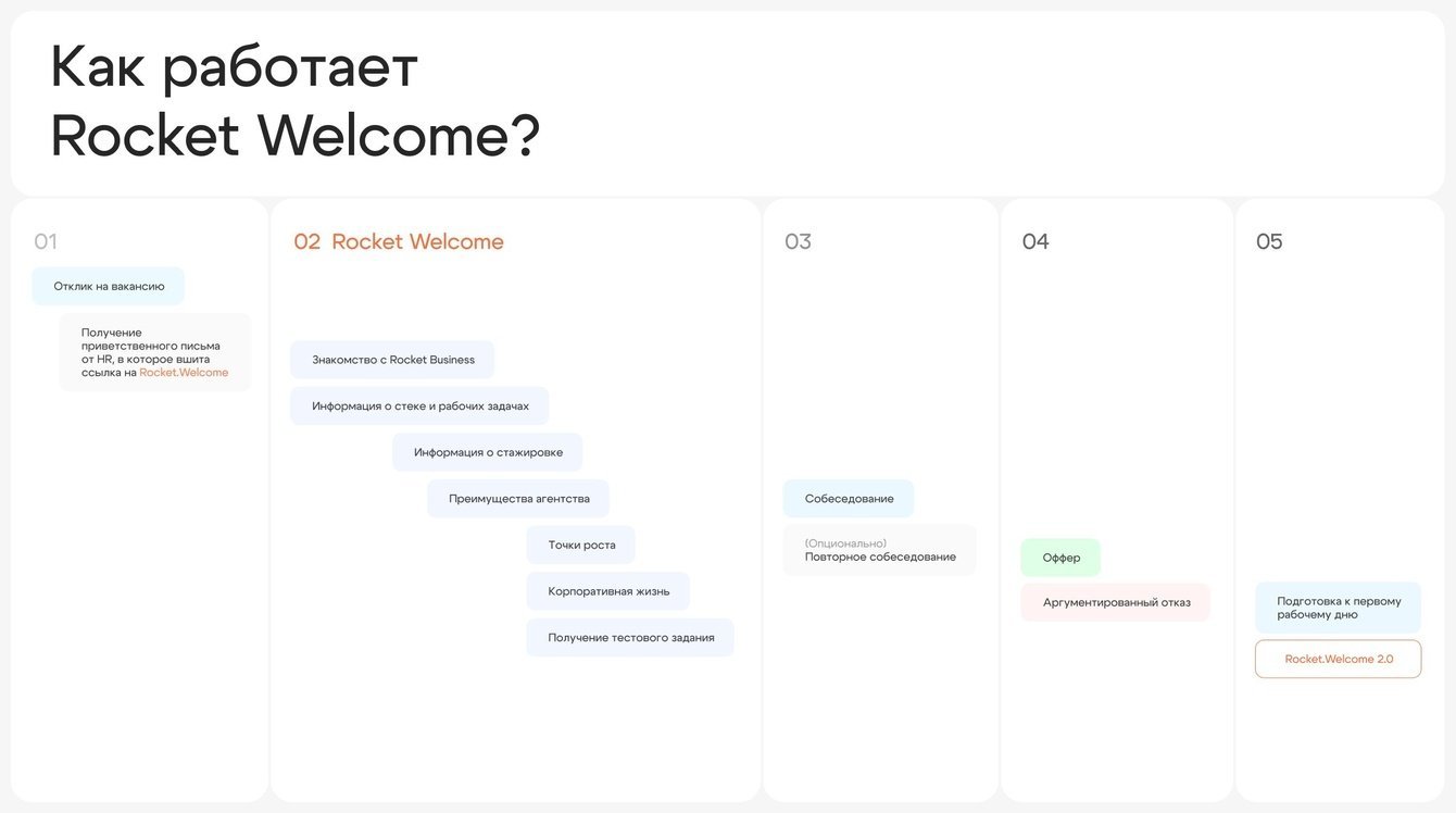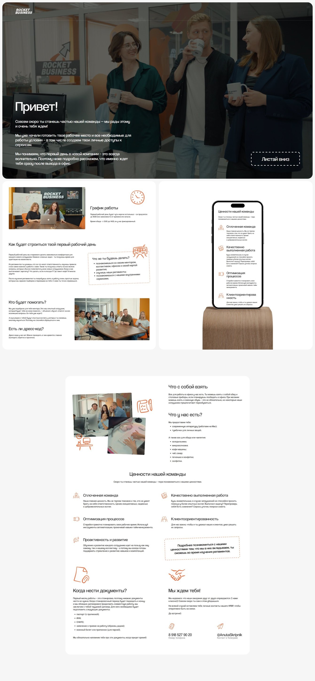 После успешного прохождения собеседования каждому новому сотруднику предоставляется персональная ссылка на Rocket.Welcome 2.0. Это одностраничный сайт-навигатор по первому рабочему дню. Там есть все, что необходимо для комфортного начала работы в компании: логистика, план первого дня, список необходимых документов, описание офисных удобств, правила компании.