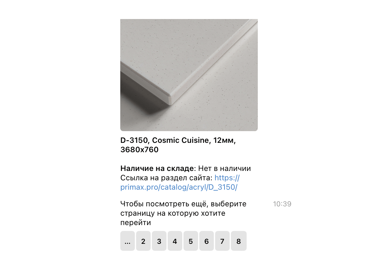 - Бот обращается к собственной базе данных и ищет совпадения по артикулу, даже если артикул указан не полностью.