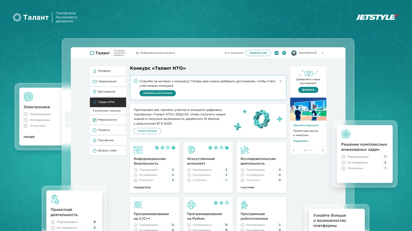 На платформе «Талант» ежегодно проходит конкурс цифровых портфолио «Талант НТО» в нескольких компетенциях — например, в 2023 году их десять. В конкурсе участвуют все зарегистрированные ученики: они зарабатывают достижения за участие в образовательных мероприятиях Кружкового движения НТИ и партнеров. Все достижения суммируются в разделе «Достижения» в течение учебного года.