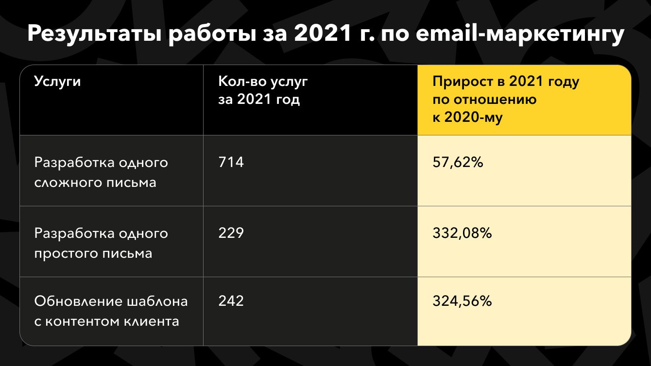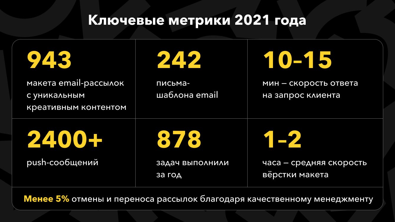 – обеспечили беспрерывный процесс разработки email-рассылок (аккаунтинг, копирайт, дизайн и вёрстку);