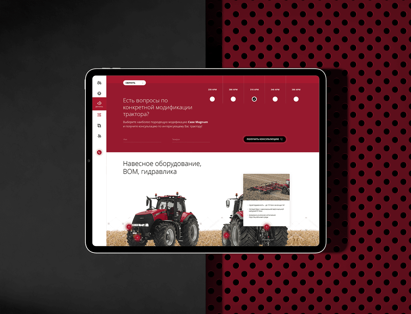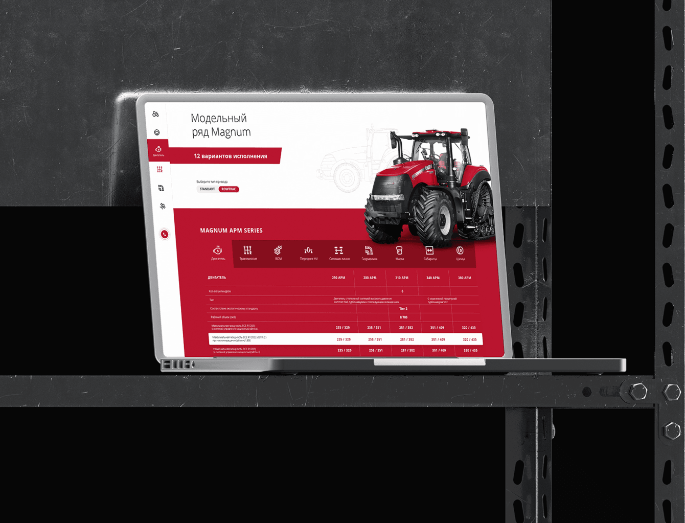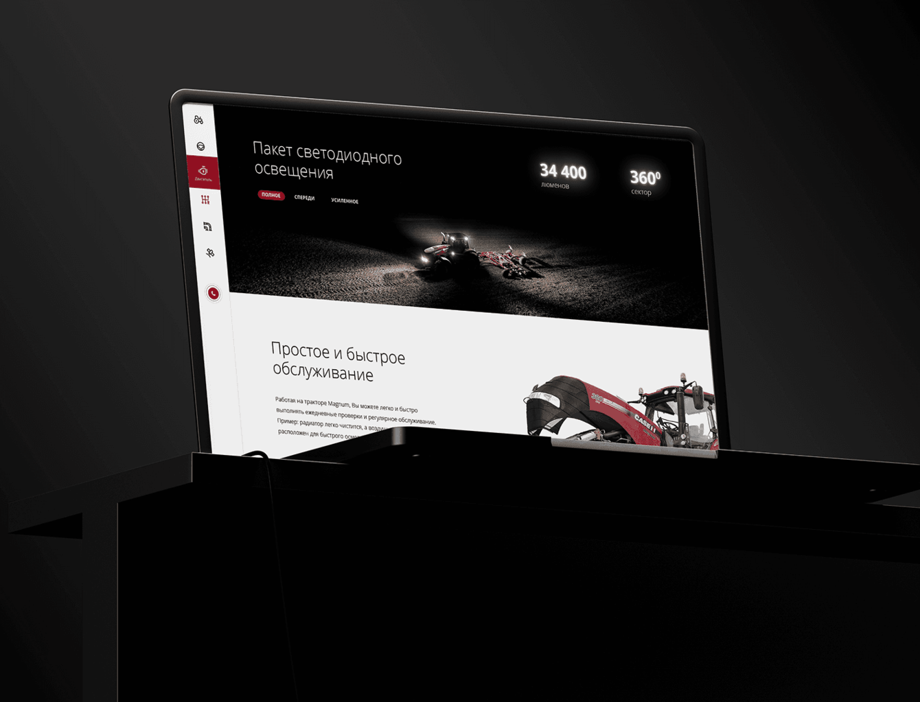Разработать дизайн для сайта, посвящённого многоцелевому трактору MAGNUM от CASE IH. Сайт должен был подчеркнуть преимущества трактора, такие как мощный двигатель, универсальность и надёжность, и обеспечить удобство взаимодействия для потенциальных клиентов.