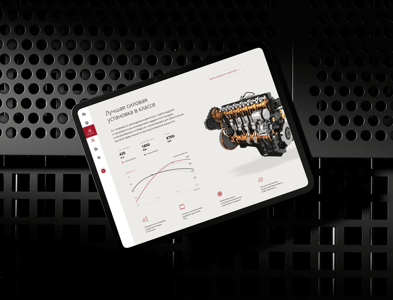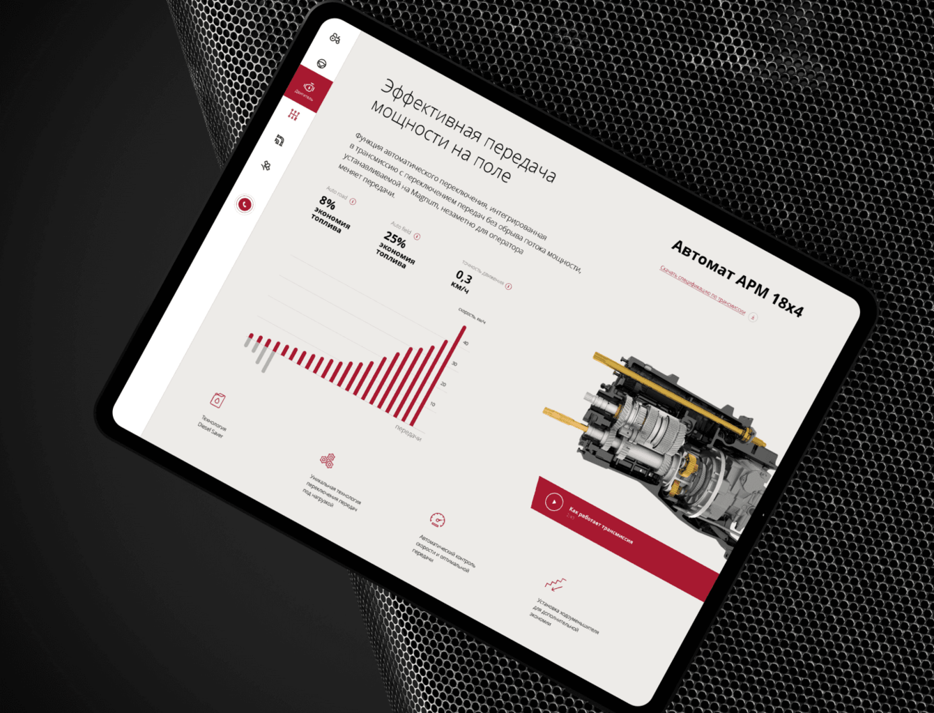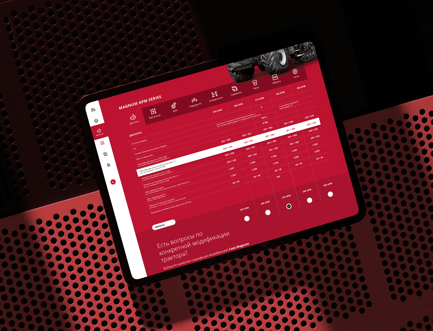 Разработан удобный интерфейс с акцентом на ключевые преимущества трактора: мощный двигатель, многофункциональность, надёжность.