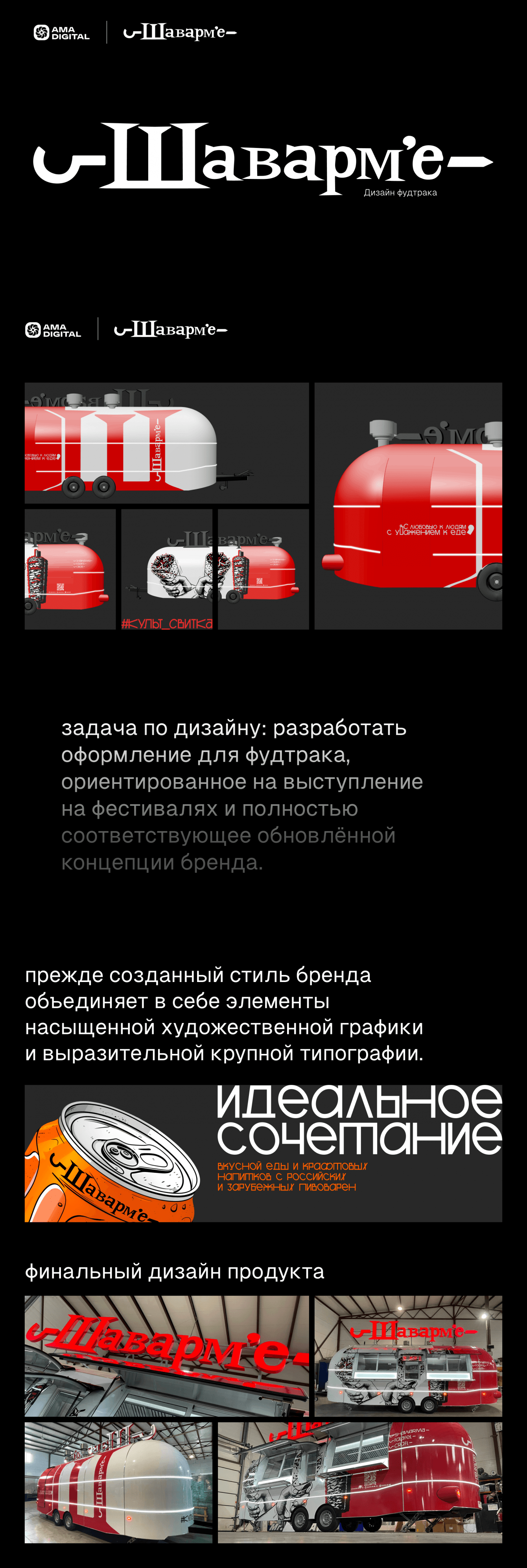 Проект для сети стрит-фуда «Шаварм’е» был разбит на этапы, синхронизированные с заказчиком на каждом шаге. Начав с разработки концептуального дизайна, мы продвинулись к его визуализации в 3D-модели, что позволило нам детально проработать каждый элемент. Завершающим этапом стало создание развертки дизайна для фудтрака, после чего проект был передан команде для нанесения графики. Этот позволило нам не только эффективно реализовать замысел, но и обеспечить высокое качество исполнения на всех уровнях.