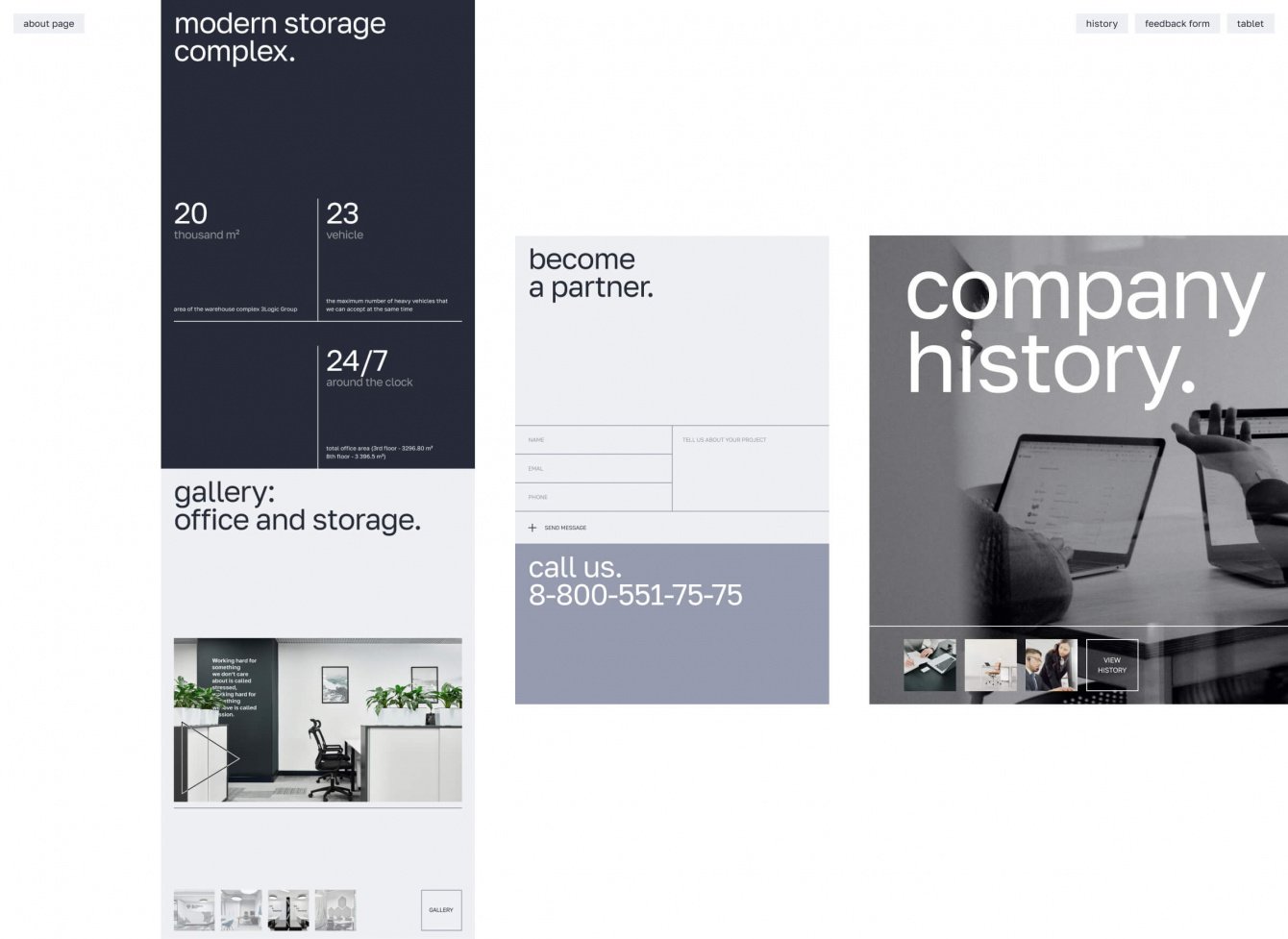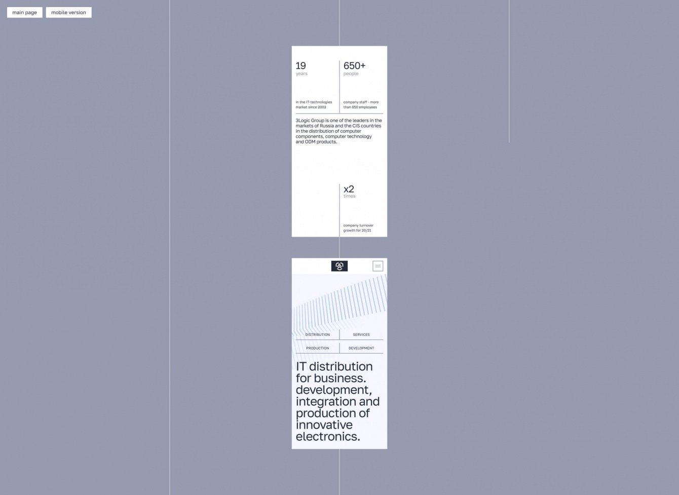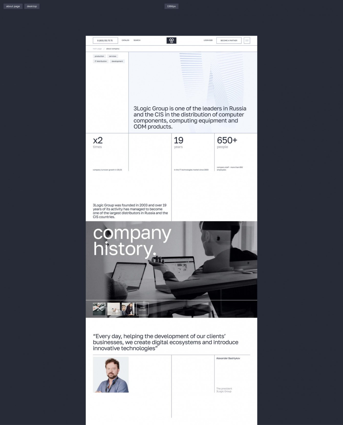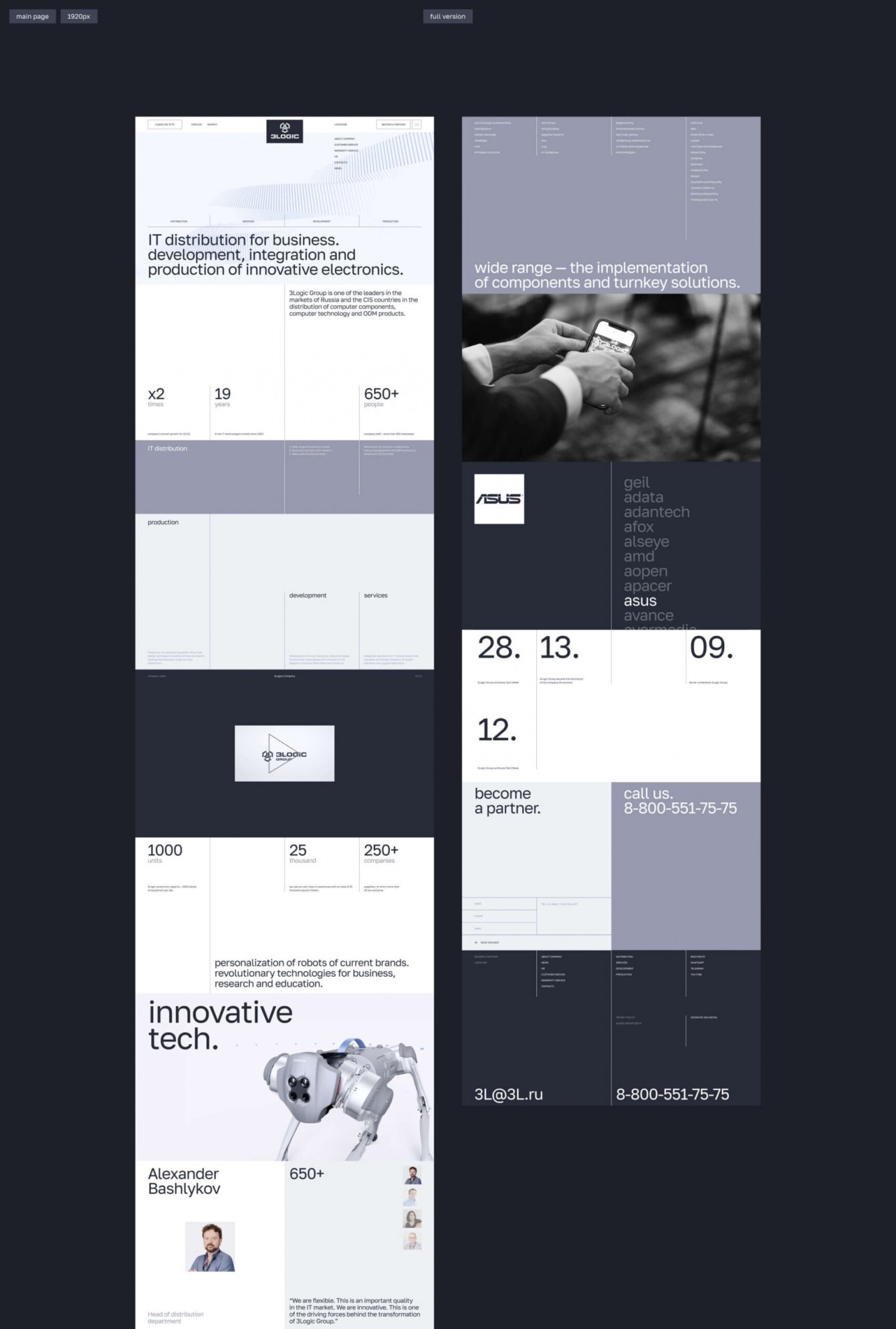 Уникальных страниц в этом проекте огромное количество - даже типовые разделы усложнены уникальными блоками и анимацией. Так, например, для блока с историей компании мы использовали анимацию, построенную на инверсии фирменных цветов. А в разделе про уникальные разработки “3LOGIC” мы разместили интерактивную схему, которая описывает все этапы работы компании.