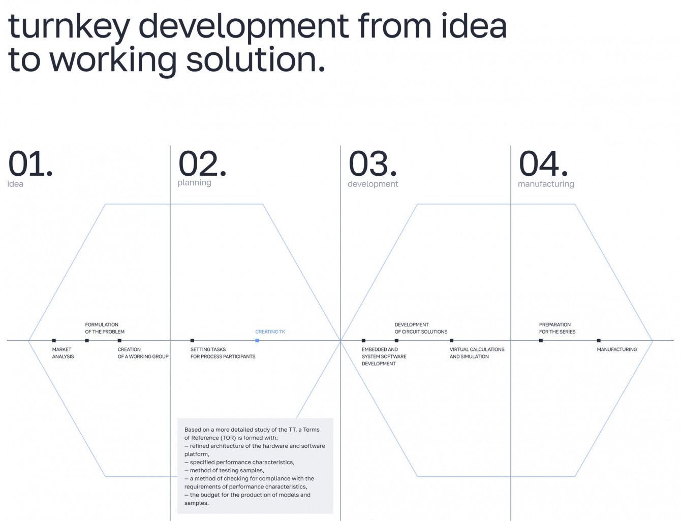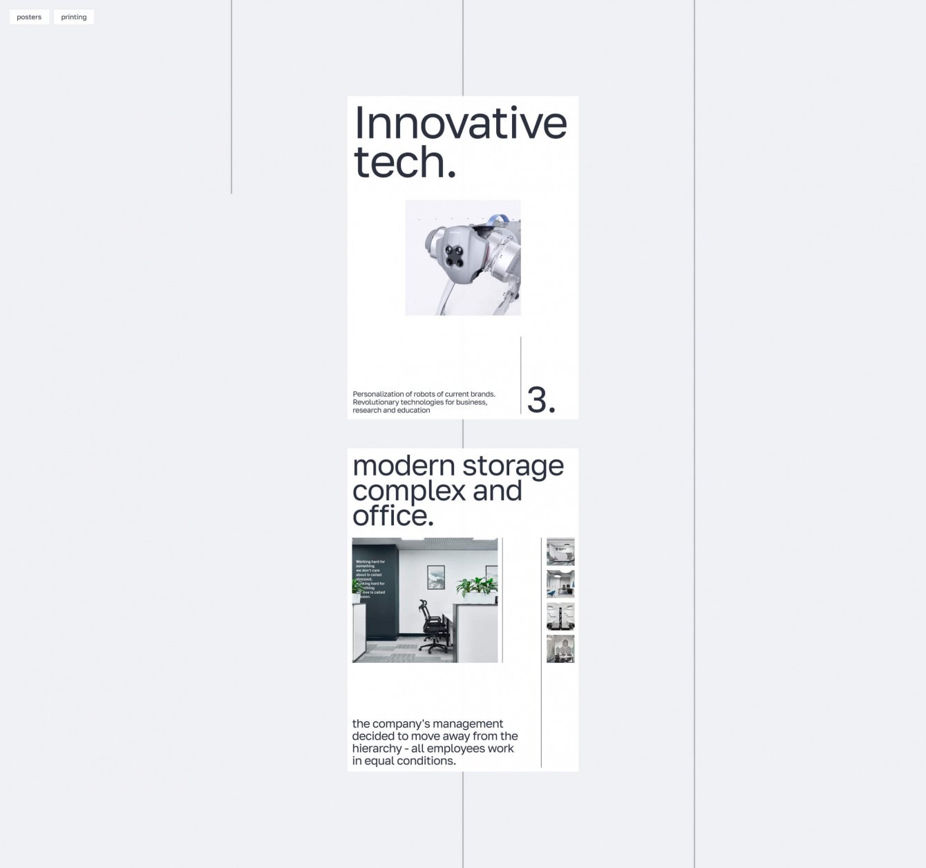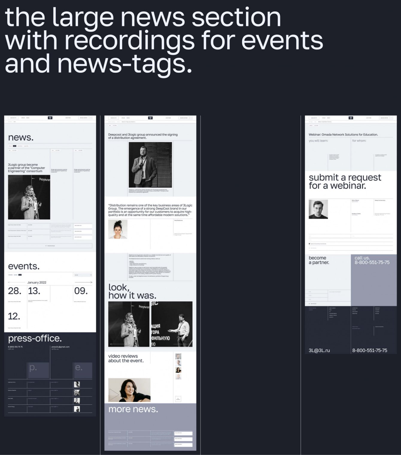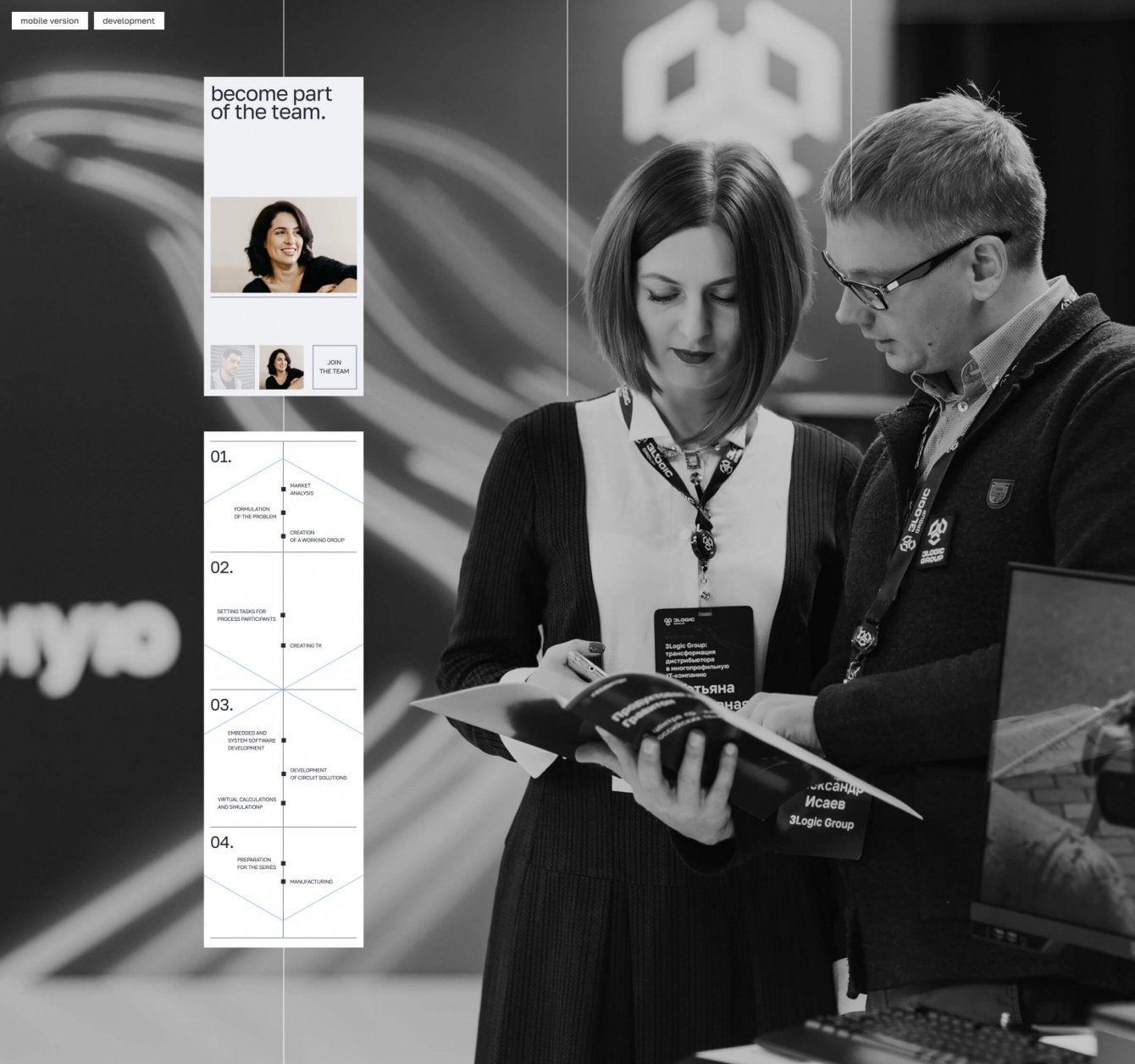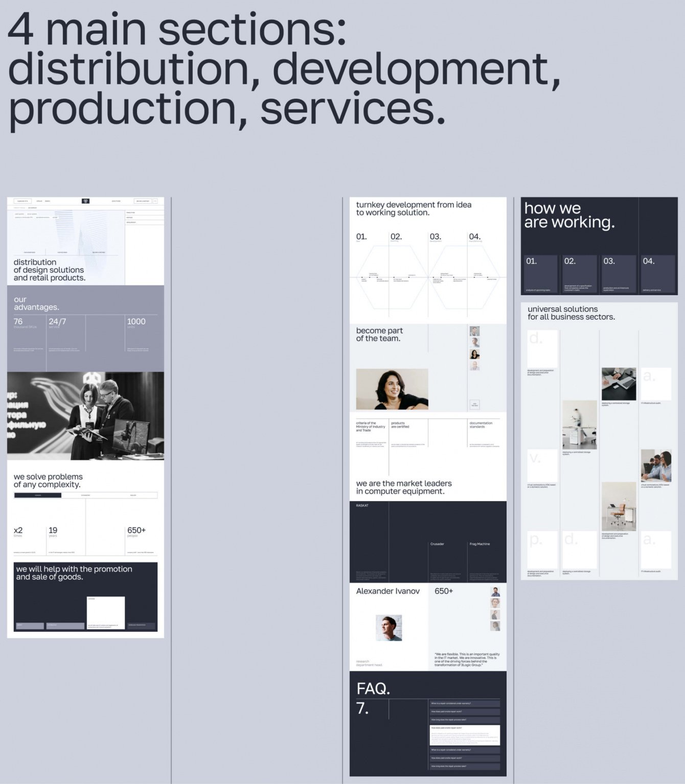 Уникальных страниц в этом проекте огромное количество - даже типовые разделы усложнены уникальными блоками и анимацией. Так, например, для блока с историей компании мы использовали анимацию, построенную на инверсии фирменных цветов. А в разделе про уникальные разработки “3LOGIC” мы разместили интерактивную схему, которая описывает все этапы работы компании.