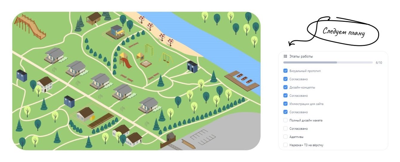 Карту-схему нарисовали в изометрическом стиле. Карта интерактивная - каждый объект является отдельным слоем, который можно включить или выключить и посмотреть, как может выглядеть абстрактная будущая турбаза и какие объекты в проекте необходимы.